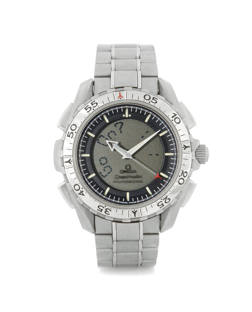 Diam. mm 41. C. titanium with case back secured by screws, rectangular buttons and graduated revolving bezel (very good). D. multifunctional display with centre seconds and luminous indexes on the outer ring (very good). M. quartz (very good). Titanium bracelet. Dial, case, movement and bracelet signed. Accompanied by Omega box and certificate dated 10/1998.
