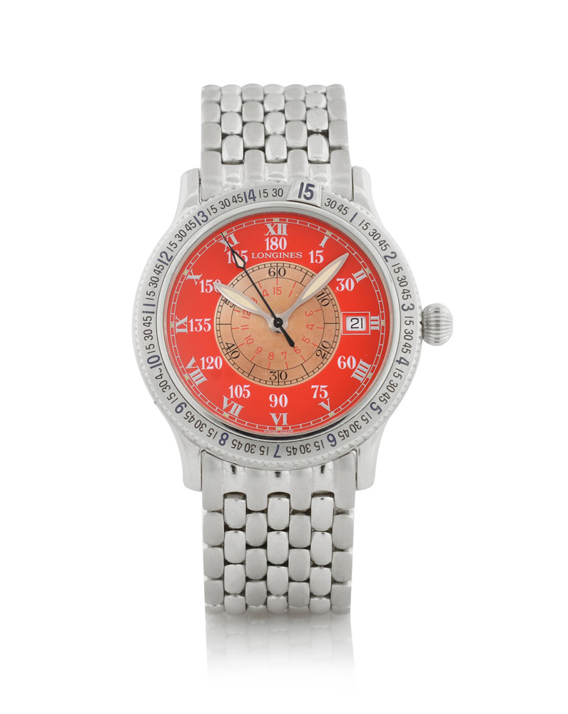Diam. mm 38. C. stainless steel with transparent case back, revolving bezel calibrated for 15 degrees and subdivisions in black enamel (good). D. bicolor red silvered with painted Roman numerals, inner scale calibrated for 180 degrees, centre seconds, inner silvered rotating disc calibrated for 60 seconds and 15 degrees (original, very good). M. self-winding (very good). Stainless steel bracelet. Dial, case, movement and bracelet signed. Accompanied by Longines box and certificate.