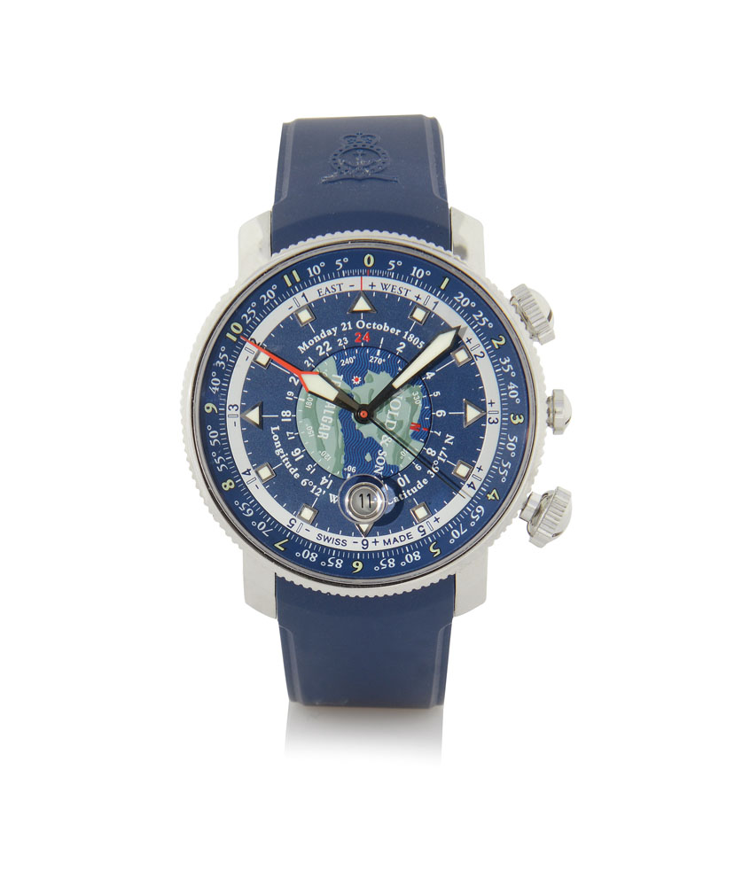 ARNOLD & SON 'LONGITUDE II' TRAFALGAR SERIE LIMITATA N. 149/200 ESEMPLARI. Cassa in acciaio con doppia corona per rotazione lunetta interna, fondello a cerniera e vetro zaffiro (ottimo). Quadrante blu con indici e lancette luminescenti, disco centrale girevole con punti cardinali e cartina policroma, data al 6 e secondi al centro, lunetta periferica con scala in gradi (come nuovo). Movimento a carica automatica (ottimo). Quadrante, cassa e movimento firmati.