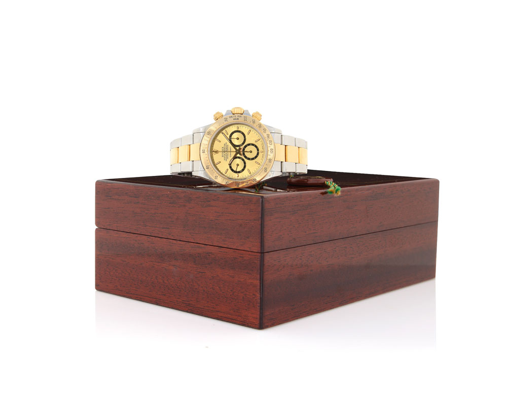 Cassa n. R944559 in acciaio e oro giallo 18 kt con fondello, corona e pulsanti a vite, lunetta con scala tachimetrica a 200 unità smaltata e vetro zaffiro (ottimo). Quadrante bicolore champagne e nero con indici applicati, contatore a 30 minuti e 12 ore (come nuovo, 6 rovesciato). Movimento a carica automatica (ottimo). Bracciale Oyster Fliplock in acciaio e oro giallo 18 kt. Quadrante, cassa, movimento e bracciale firmati. Completo di astuccio originale.