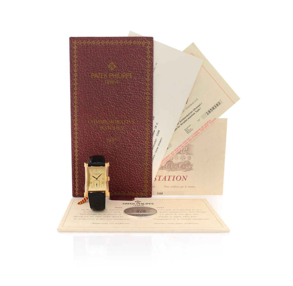 Dim. mm 40x29. C. rectangular with curved sides 18K yellow gold (mint). D. champagne with applied Roman numerals and subsidiary seconds (as new). M. manual winding (very good). Dial, case and movement signed. Accompanied by Patek Philippe strap, 18K yellow gold buckle, box, certificate dated 11/1997, attestation and commemorative medal.