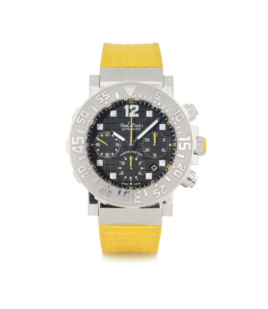 Diam. mm 45. C. stainless steel with screwed case back, crown and buttons, graduated and revolving bezel, sapphire crystal (as new). D. black engraved with luminous indexes, Arabic numerals and hands, 30 minute and 12 hour registers, date between 4 and 5 (as new). M. self-winding (very good). Dial, case and movement signed. Accompanied by Paul Picot strap, stainless steel deployant clasp, box, blank certificate and C.O.S.C certificate.