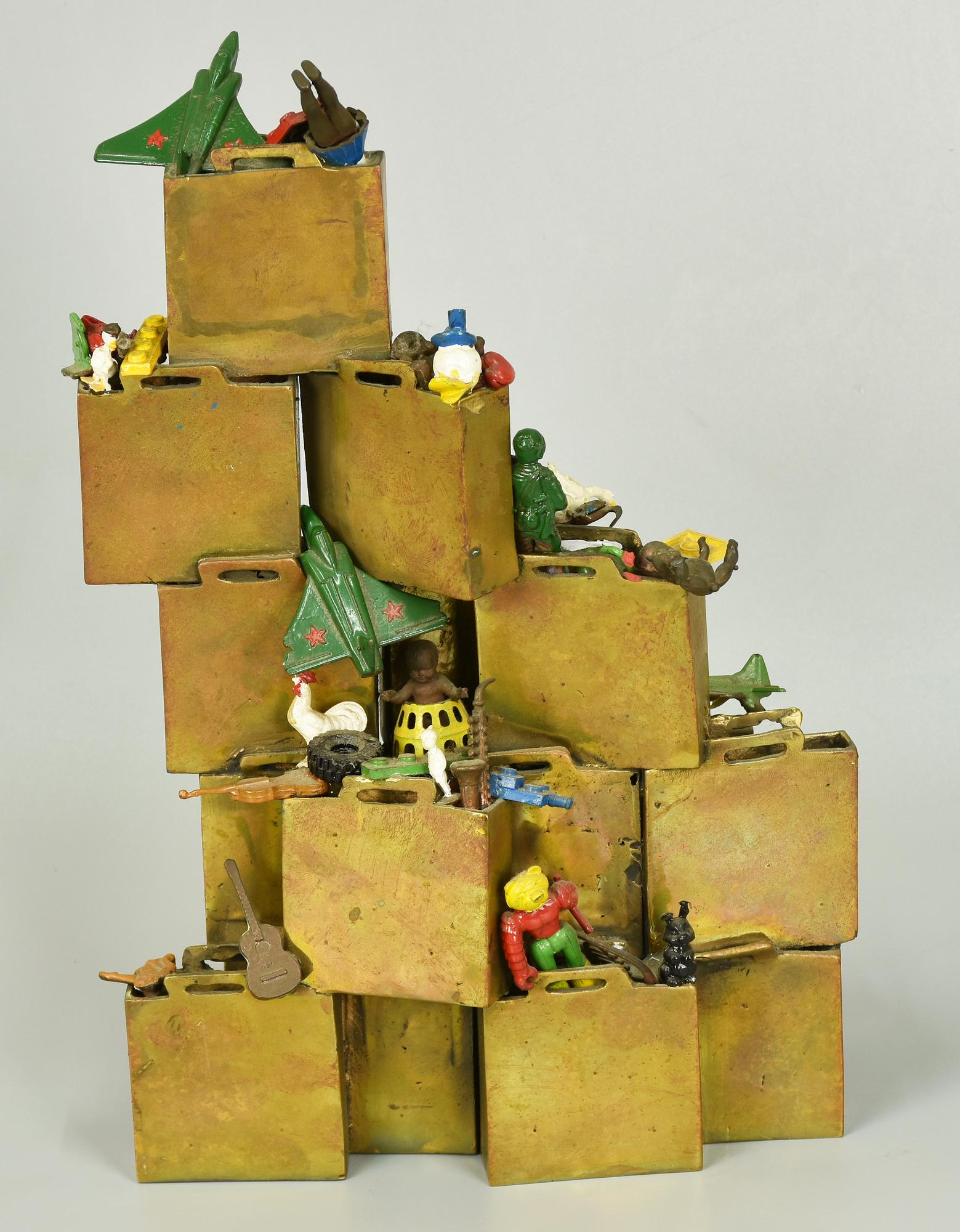 Innocente CONTENITORI CONTENUTI scultura in ottone dorato con applicazioni in...