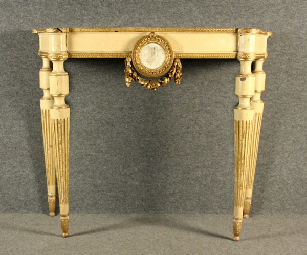 Firmato. Console in legno di noce, gambe scanalate con al centro una placca in bisquit rilaccata. Periodo Luigi XVI. Difetti. Mis. Lung. cm. 115 Alt. cm. 92 Prof. cm. 44 ca.