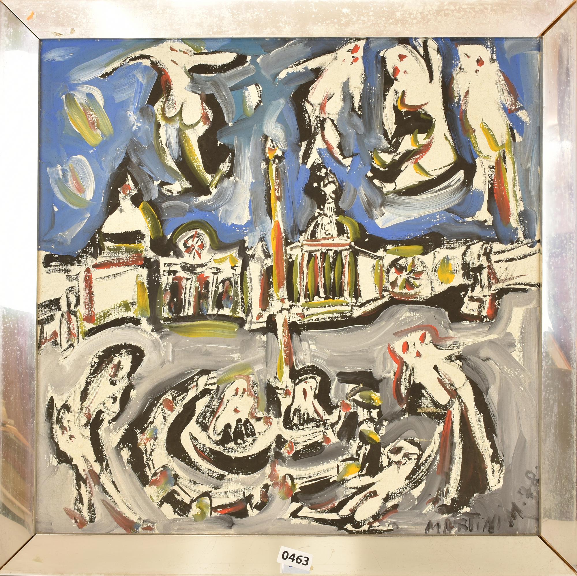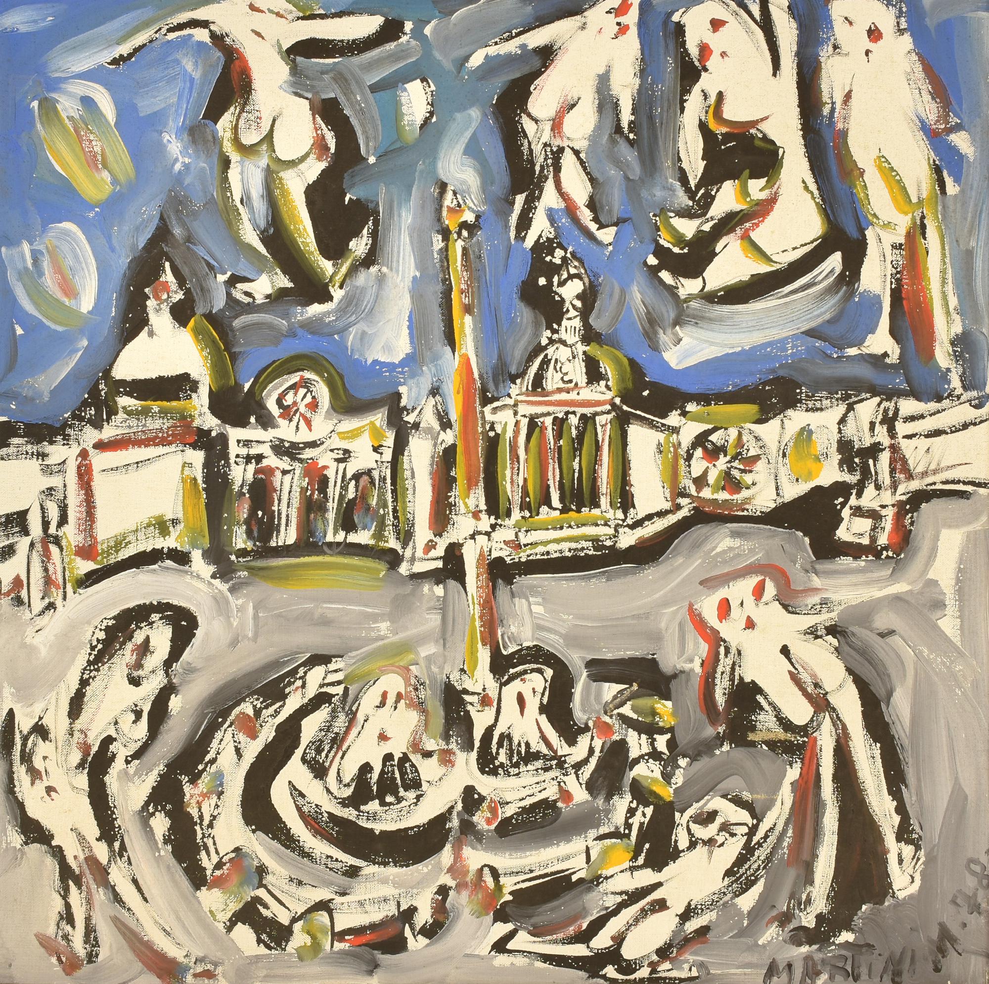 Mario Martini OBELISCO ROMANO E FIGURE olio su tela, cm 60x60 firma e data...