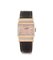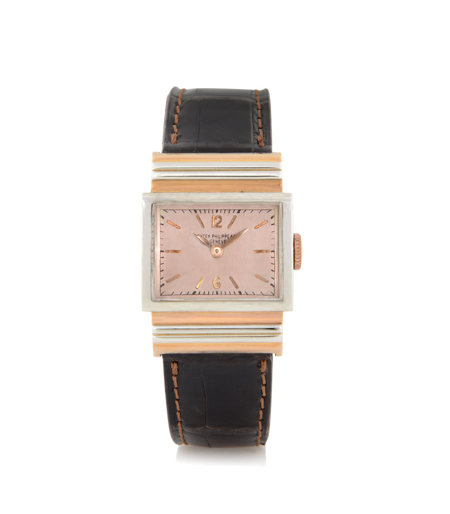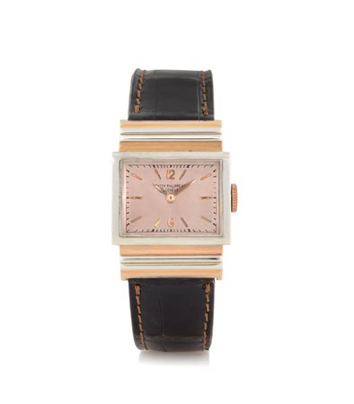 Cassa carré n. 616709 in oro rosa e bianco 18 kt con fronte rettangolare e anse coperte bombate e gradinate, monogramma DPS inciso sul fondello (ottimo). Quadrante argentato-rosa con indici applicati (originale, indelebile, ottimo). Movimento n. 198478 a carica manuale (ottimo). Quadrante, cassa e movimento firmati. Completo di fibbia in oro rosa originale e di estratto di registro.