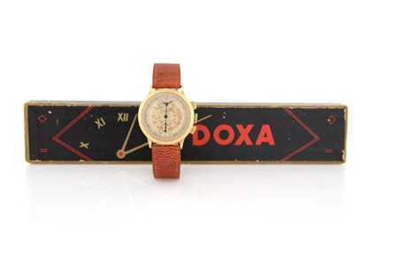 Diam. mm 32. C. 14K yellow gold with hinged case back, oval-shaped buttons, engraved inscription dated 1938, downturned with fixex bars lugs (very good). D. silvered, subsidiary off-center hour dial with Arabic numerals, 30 minutes register at 6, inner tachymetre scale (original, aged, good). M. manual winding (good). Dial, case and movement signed. Accompanied by Doxa box.