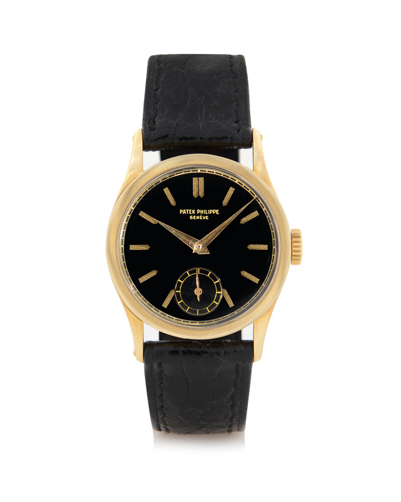 Diam. mm 30. C. 18K yellow gold (excellent). D. glossy black with applied indexes, subsidiary seconds (original, excellent). M. manual winding (very good). Dial, case and movement signed. Accompanied by Patek Philippe 18K yellow gold old buckle and Extract from the Achives.