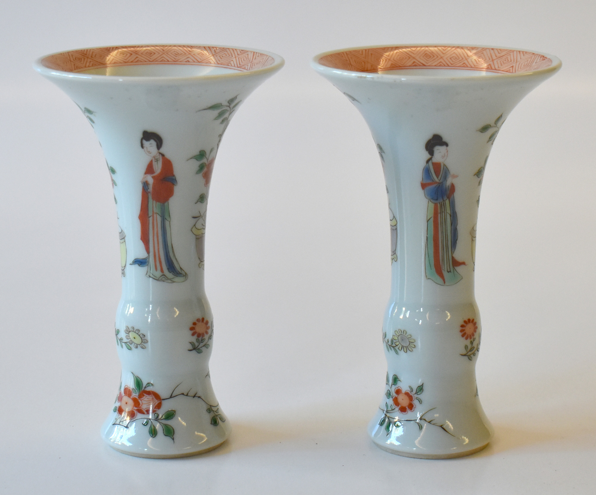 Cina coppia di vasi a tromba in porcellana bianca decorata con personaggi e motivi vegetali