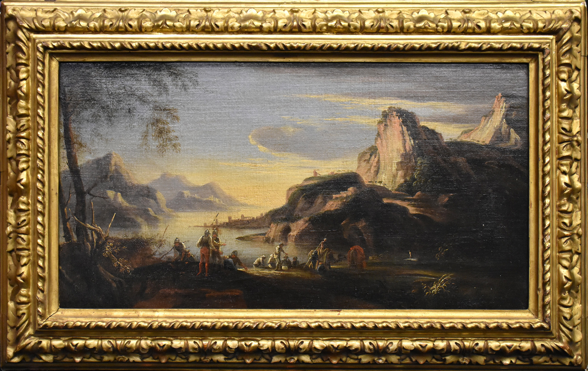'Paesaggio montano con corso d'acqua e personaggi' olio su tela sec.XVII