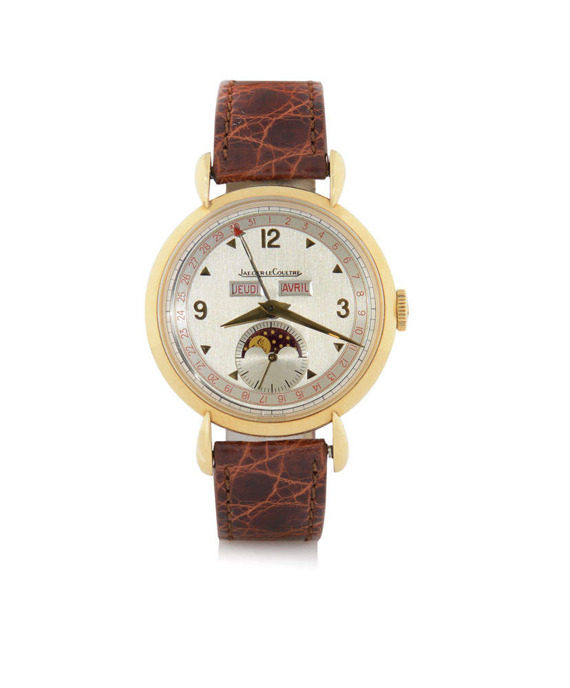 Diam. mm 36. C. 18K yellow gold with teardrop lugs (very good). D. two-tone silvered with applied indexes and Arabic numerals, subsidiary dial for seconds and phases of the moon, aperture for the day of the week and month at 12, outermost date with corresponding central hand (original, very good). M. manual winding (very good). Dial, case and movement signed. Accompanied by Jaeger le Coultre 18K yellow gold buckle.