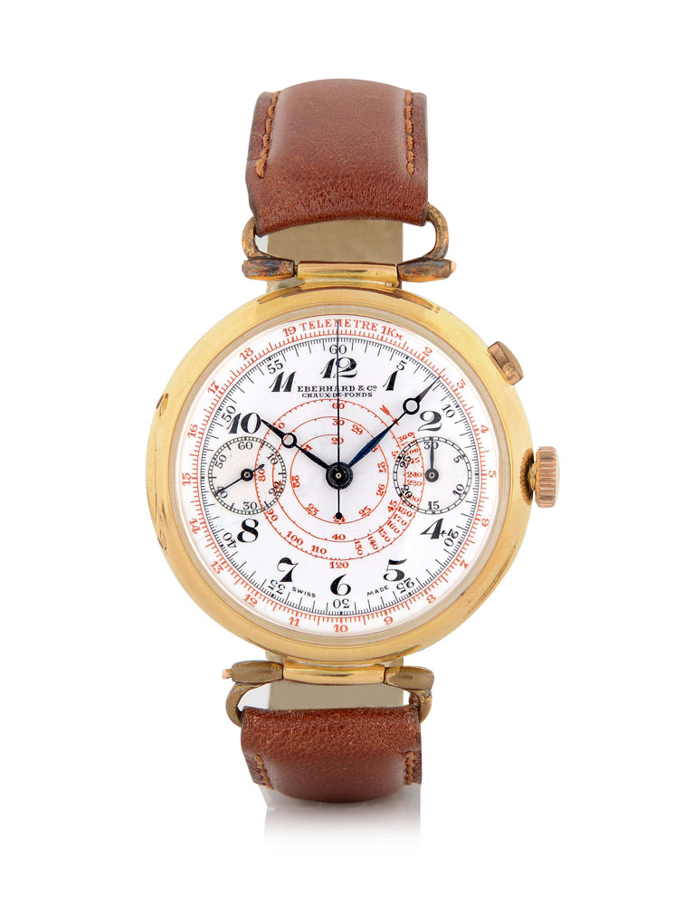 Diam. mm 40. C. 18K yellow gold with hinged case back and bezel, fixed bars lugs and olive-shaped button at 2 (good). D. enamel with painted Arabic numerals, 30 minutes register, inner spiral tachymetre scale and outer telemetre scale (original, good). M. manual winding (good). Dial, case and movement signed.