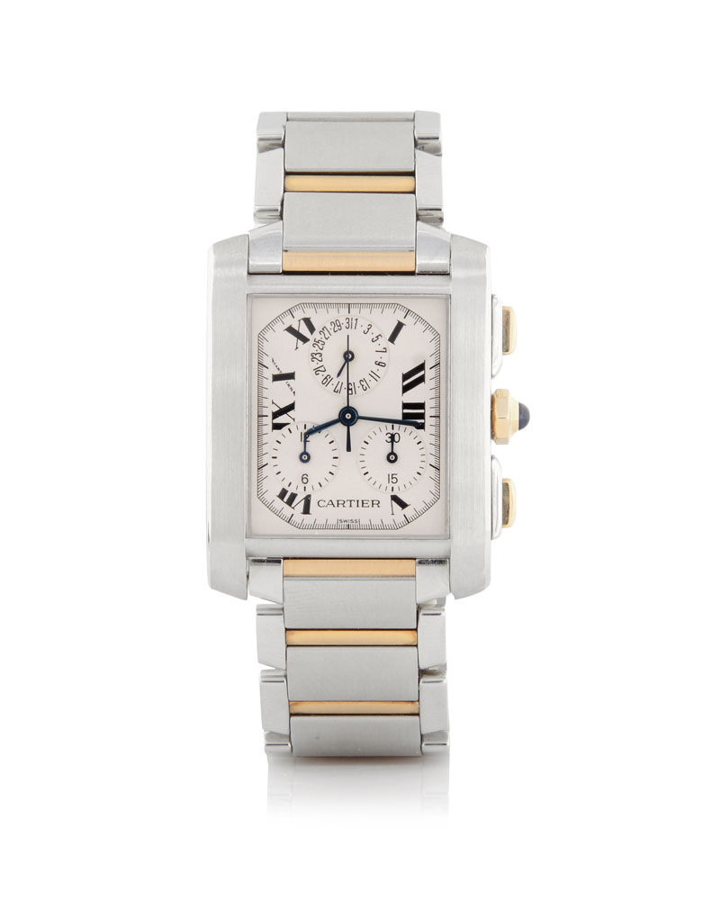 Dim. mm 36x29. C. rectangular, stainless steel and 18K yellow gold steel with case back secured by screws, rectangular buttons and sapphire crystal (very good). D. silvered with painted Roman numerals, 30 minute and 12 hour registers, subsidiary dial for date (very good). M. quartz (very good). 18K yellow gold and stainless steel bracelet. Dial, case, movement and bracelet signed.