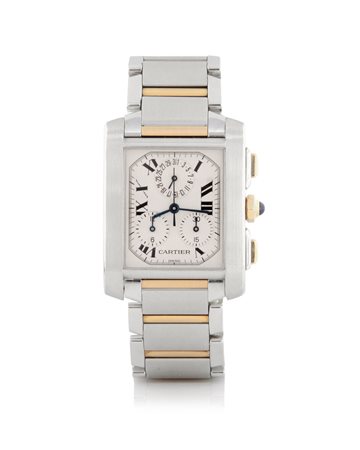 Cassa n. BB25142 rettangolare in acciaio e oro giallo 18 kt con fondello chiuso da viti, pulsanti rettangolari e vetro zaffiro (ottimo). Quadrante argentato con numeri romani smaltati, contatore a 30 minuti e 12 ore, data a sfera (ottimo). Movimento ibrido al quarzo (ottimo). Bracciale in acciaio e oro giallo 18 kt. Quadrante, cassa, movimento e bracciale firmati.