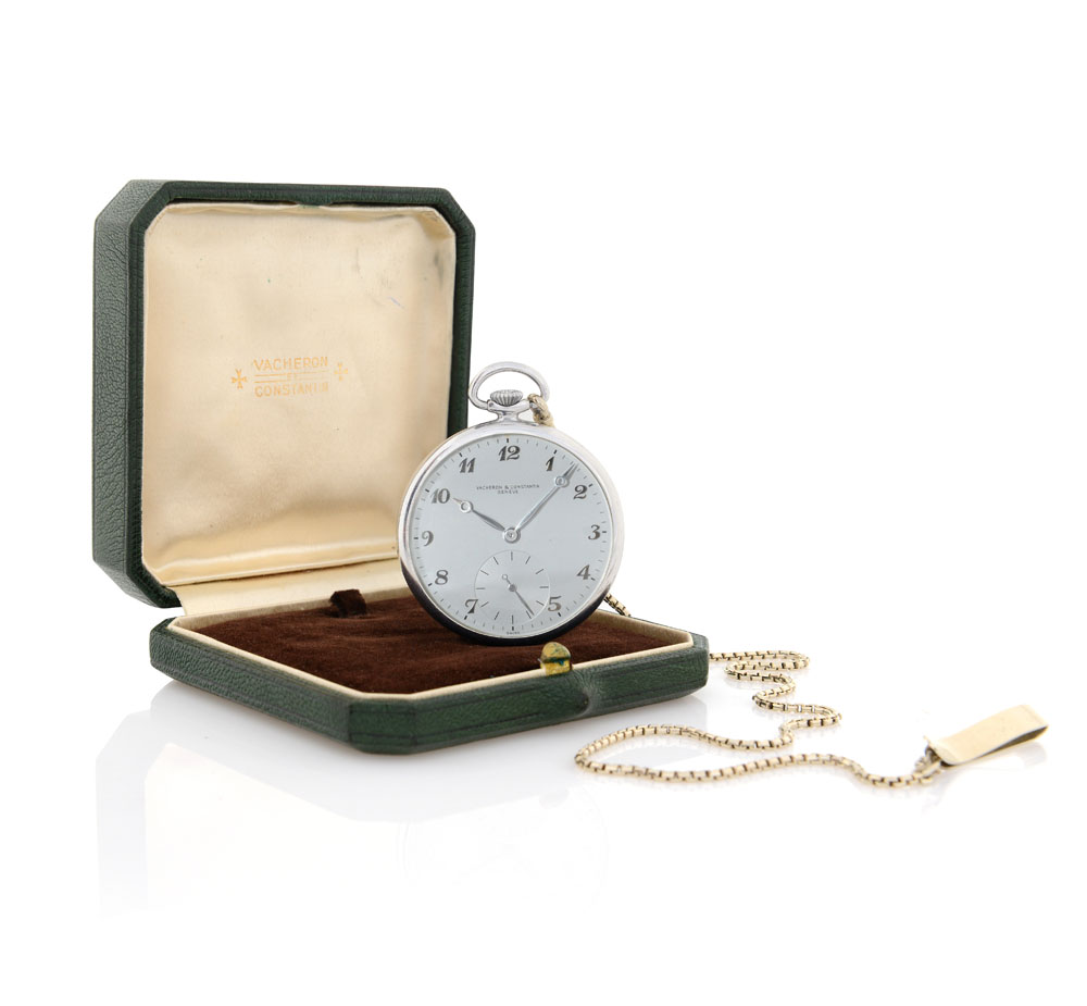 Diam. mm 44 gr. 21. C. openface, aluminum (very good). D. aluminum with applied aluminum Breguet numerals, subsidiary seconds (original, very good). M. aluminum, anchor escapement with swan neck regulator, keyless dress (very good). Dial, case and movement signed. Accompanied by 18K white gold chain and Vacheron Constantin box.