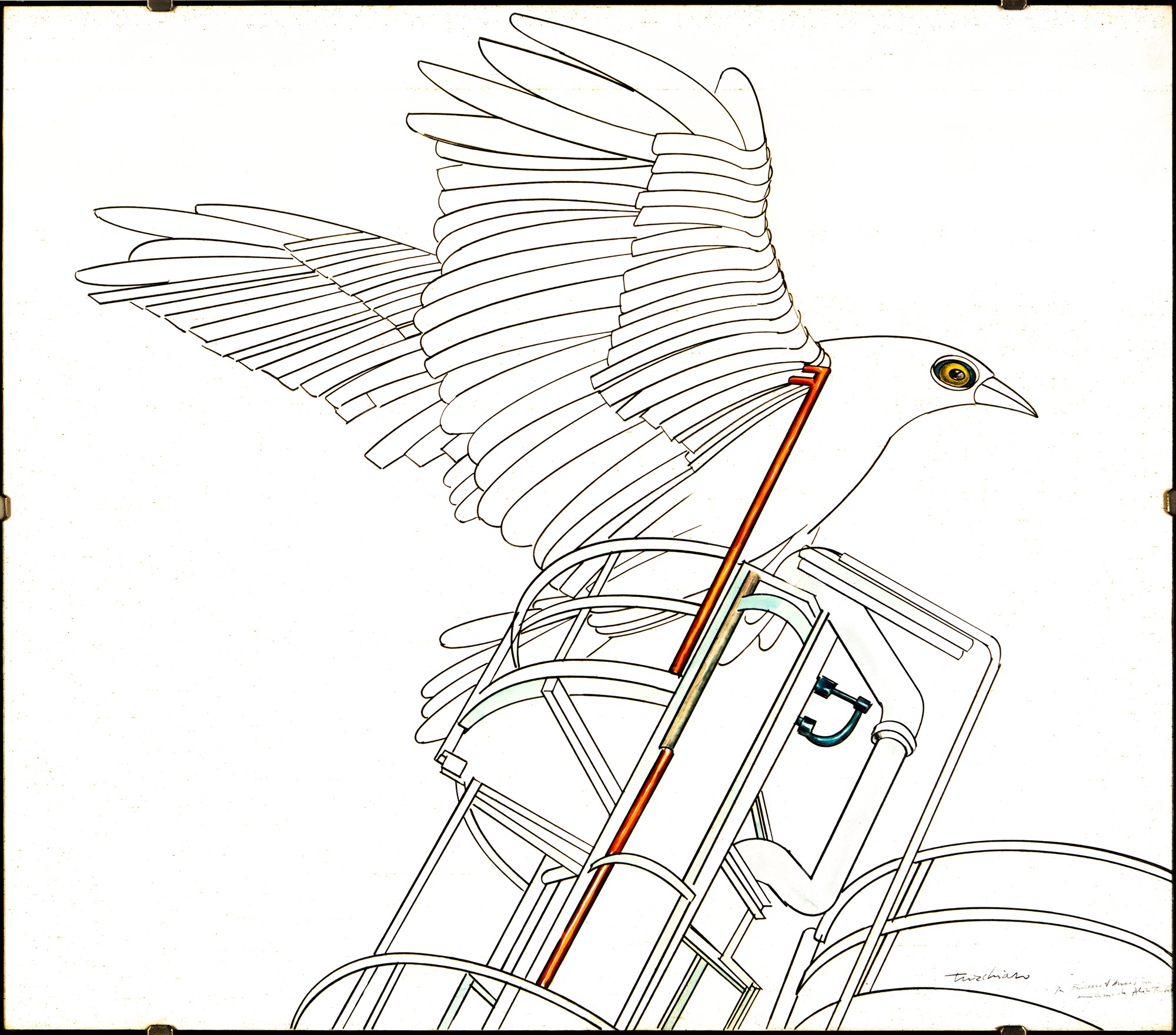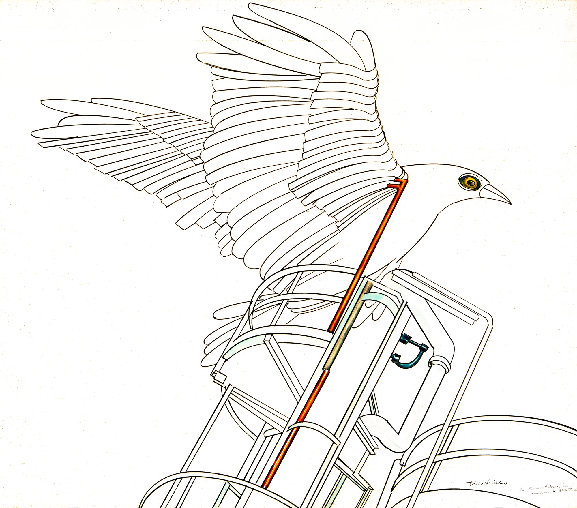 Senza titolo matita e acquarello su carta cm 68x78 Firma e dedica in basso a destra "Turchiaro, Per Francesco D'Arcais con amicizia da Aldo Turchiaro" Uomo e Macchina, 1977, Civiltà delle Macchine, anno XXV, maggio-agosto 197, pp. 59,61,63