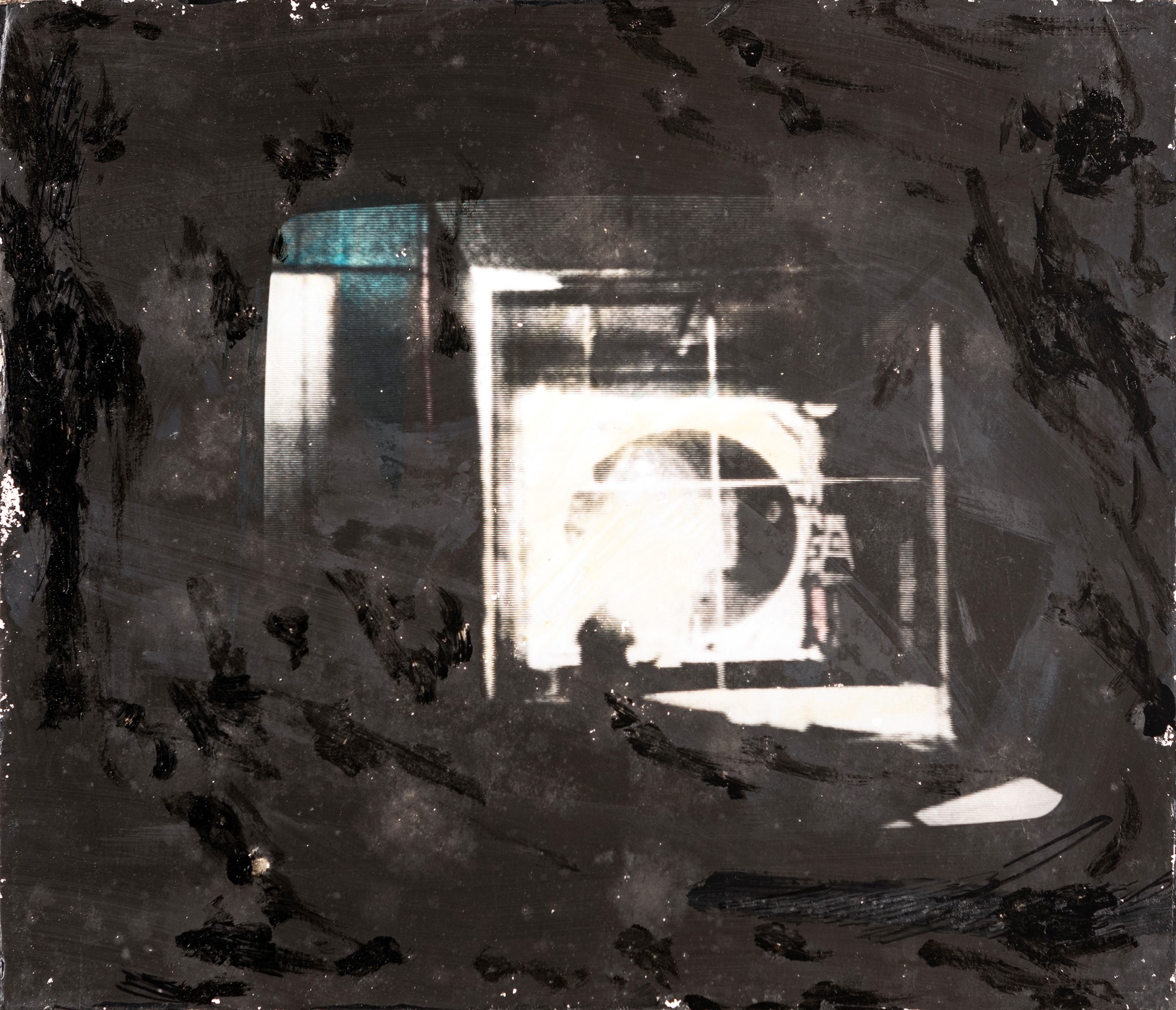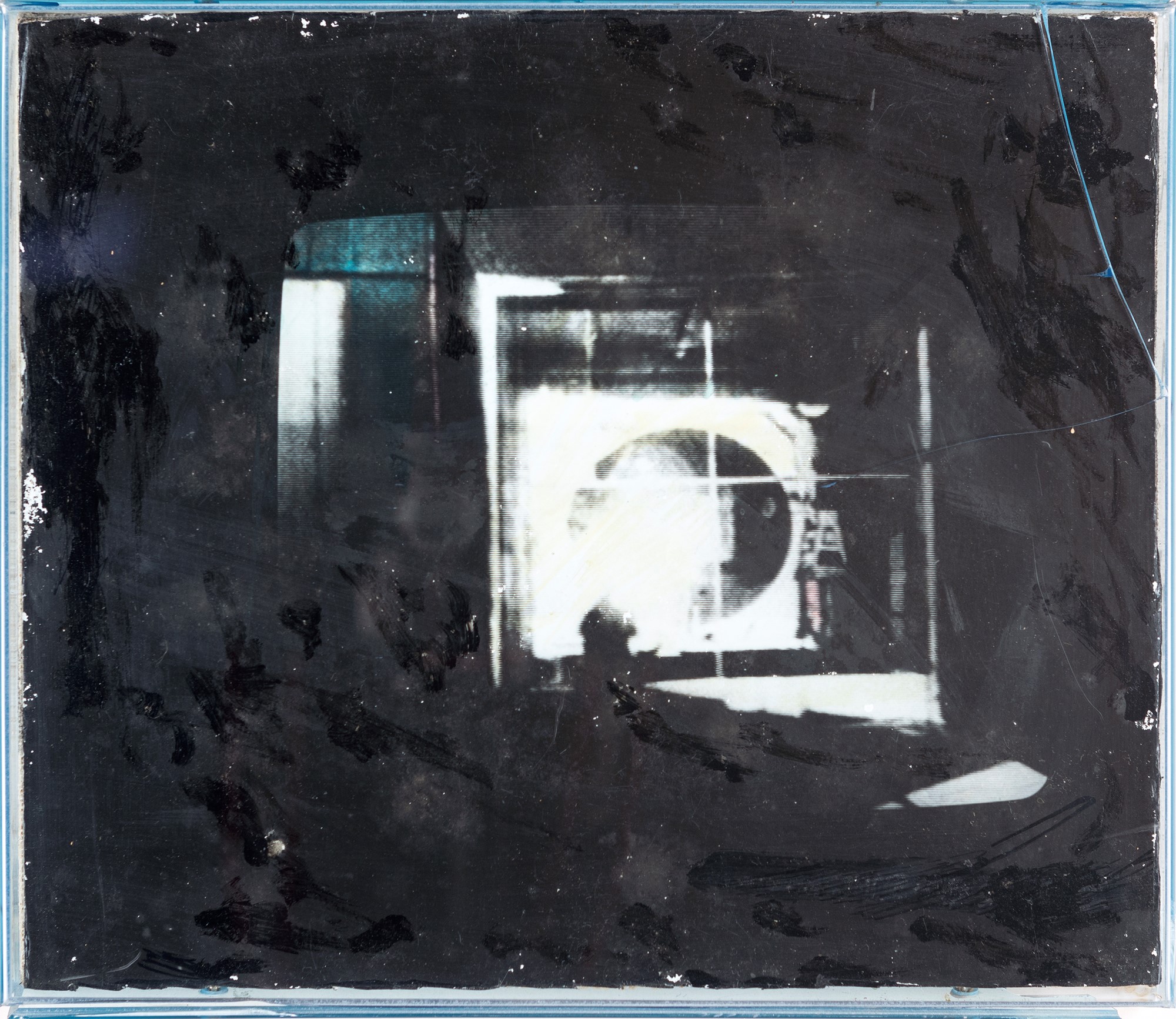 Senza titolo 1971-72 Tecnica mista su fotografia stampata ai sali d'argento su carta baritata intelata, perspex cm 23,5x27,5 Firma al verso "Schifano". Certificato di autenticità rilasciato dall'Archivio Mario Schifano, Roma