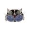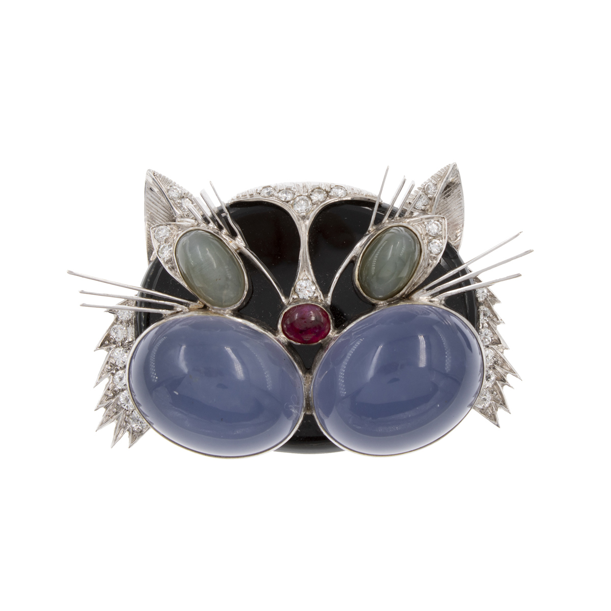 Spilla gatto in oro bianco 18kt peso 25 gr. centrata da calcedonio blu e chiaro di luna taglio cabochon, diamanti taglio brillante ct 0,40 circa, dimensioni 4,3x2,2 cm.
