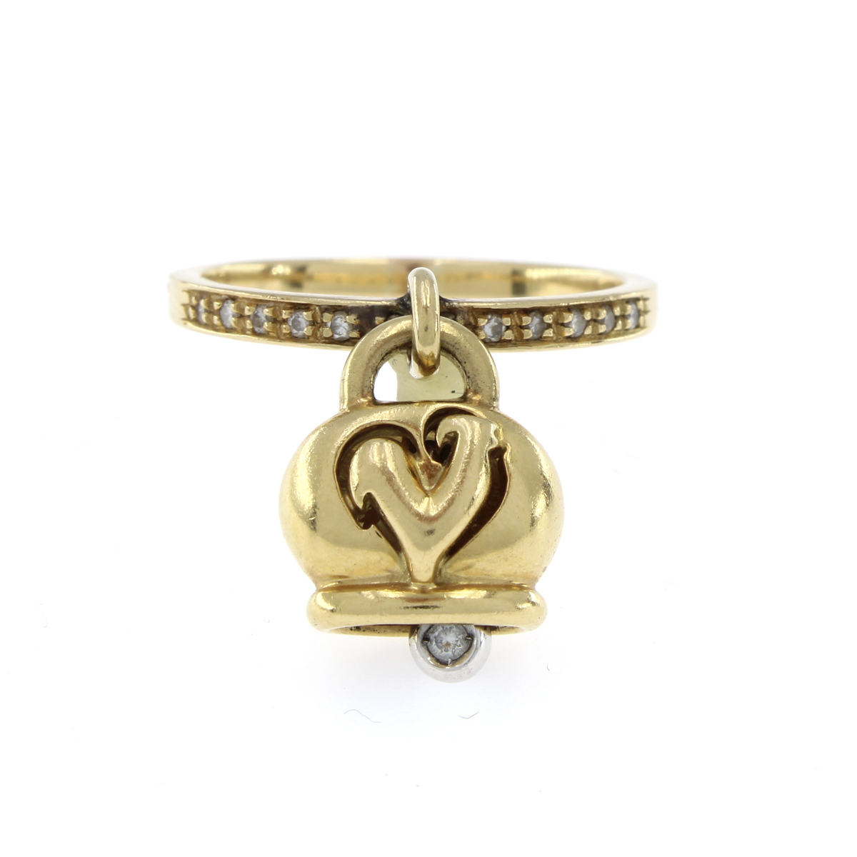 Chantecler anello collezione Campanelle firmato peso 6 gr. in oro giallo 18kt e diamanti taglio huit-huit, campanella pendente in oro con un diamante taglio brillante incastonato su oro bianco, misura 16