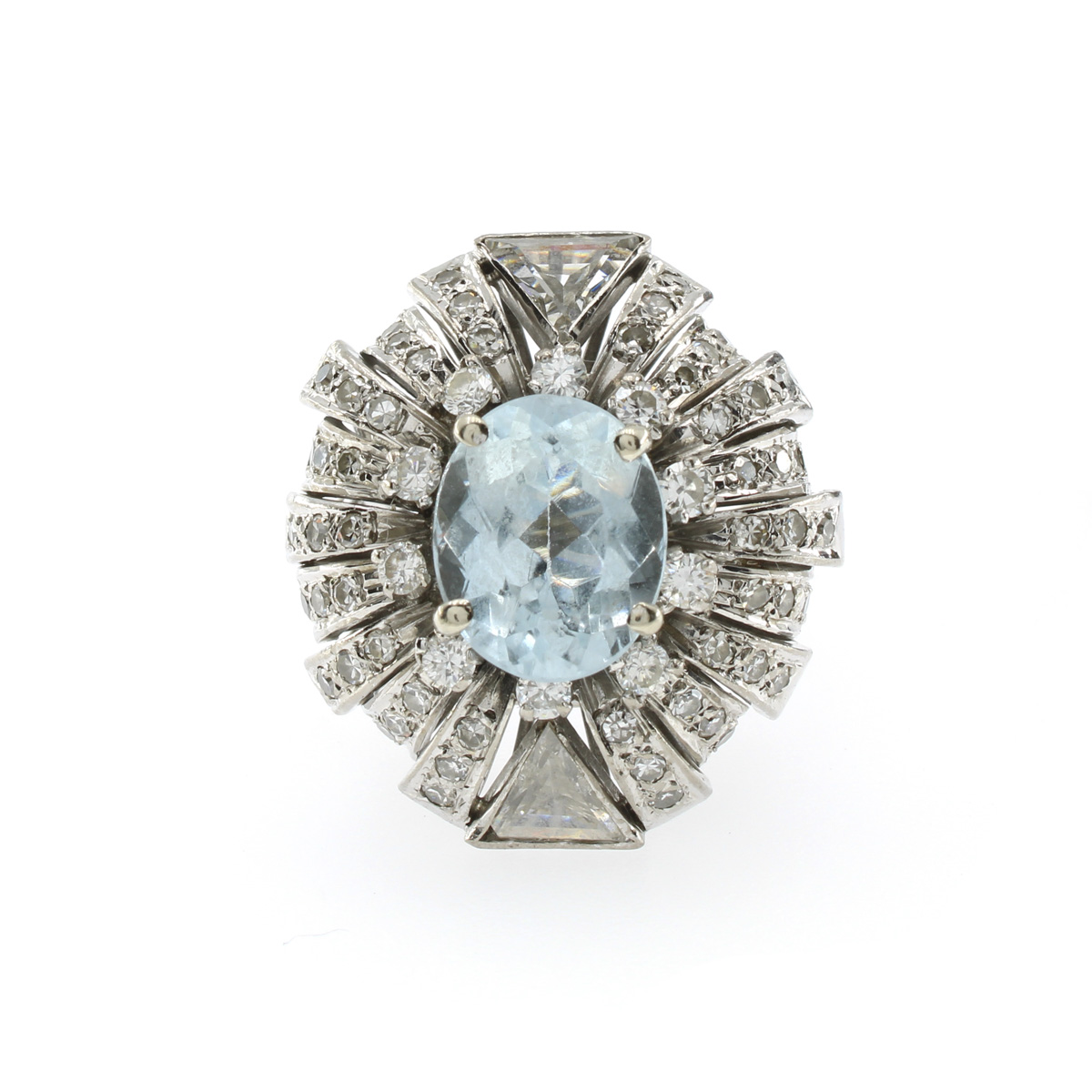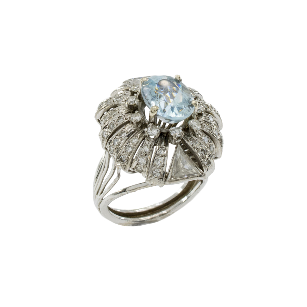 Anello in oro bianco 14kt acquamarina e diamanti anni 40/50 peso 11 gr. acquamarina taglio ovale misto contornata da diamanti taglio brillante ct 0,70 circa e due diamanti taglio a triangolo ct 0,90 circa, misura 15