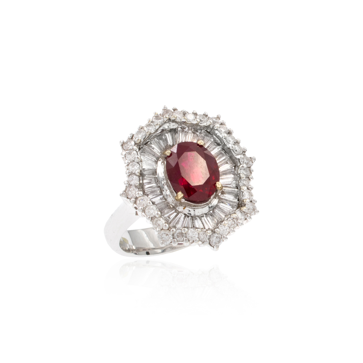 Anello in oro bianco 18kt con rubino naturale peso 10 gr. taglio ovale misto ct 2,26 circa contornato da diamanti taglio brillante e baguette ct 1,60 circa colore H/I - purezza SI - colore G/H - purezza VVS/VS, misura 14, completo di certificato gemmologico