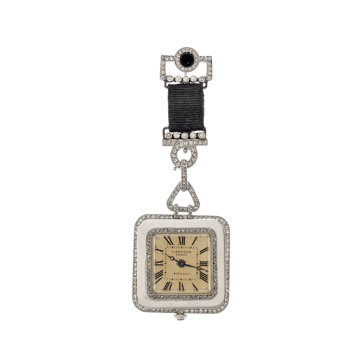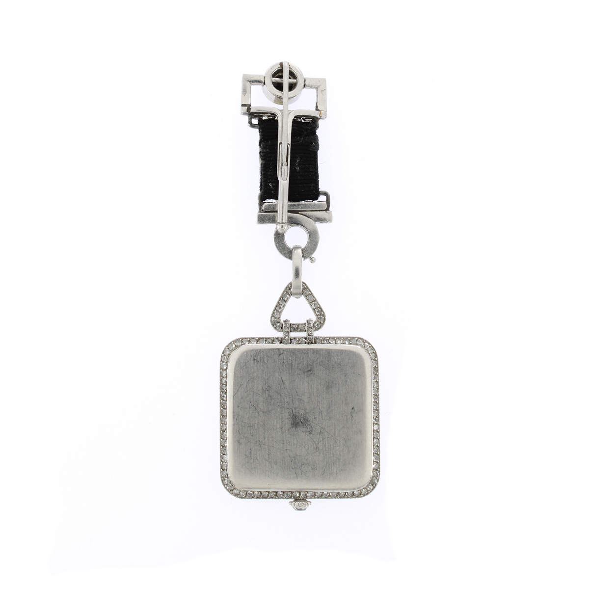 Cartier orologio Decò anno 1925 in platino e rose di diamante sospeso ad una châtelaine in platino onice nero e rose di diamante, cassa carré 27x27, ref. 5306-4185- 7344, quadrante guilloché con numeri romani, segni di usura, movimento meccanico a carica manuale