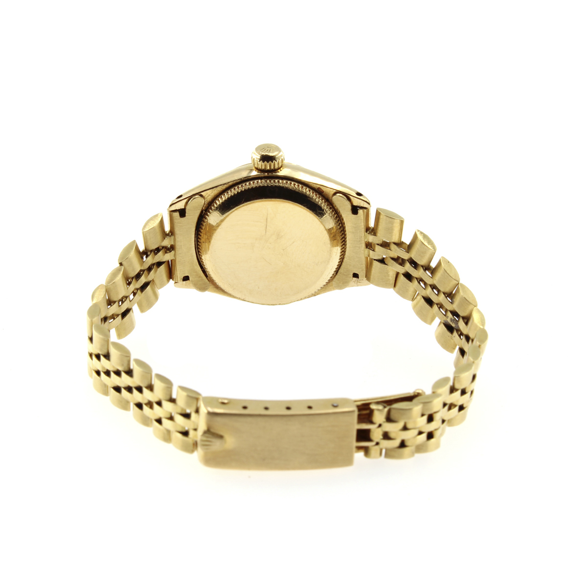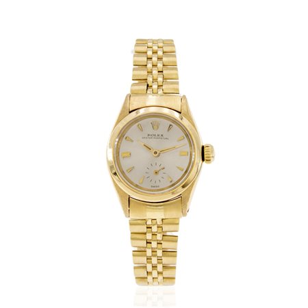 Rolex Oyster Perpetual orologio da donna vintage anni 50 circa peso 48 gr. in oro giallo 18kt, ref. 6504 - 128888 , cassa tonda 25 mm. quadrante argentato con indici ristampato, contasecondi ore 6, movimento meccanico a carica automatica, calibro 1120, bracciale jubilee in oro giallo 18kt con chiusura deployante, cassa e movimento firmati