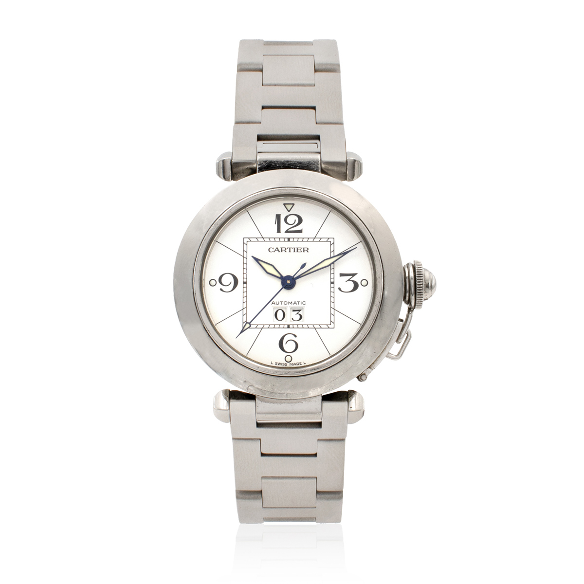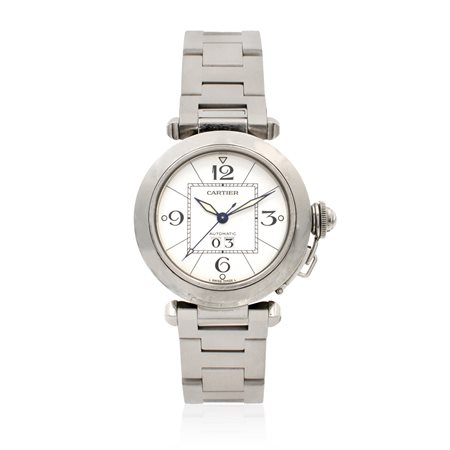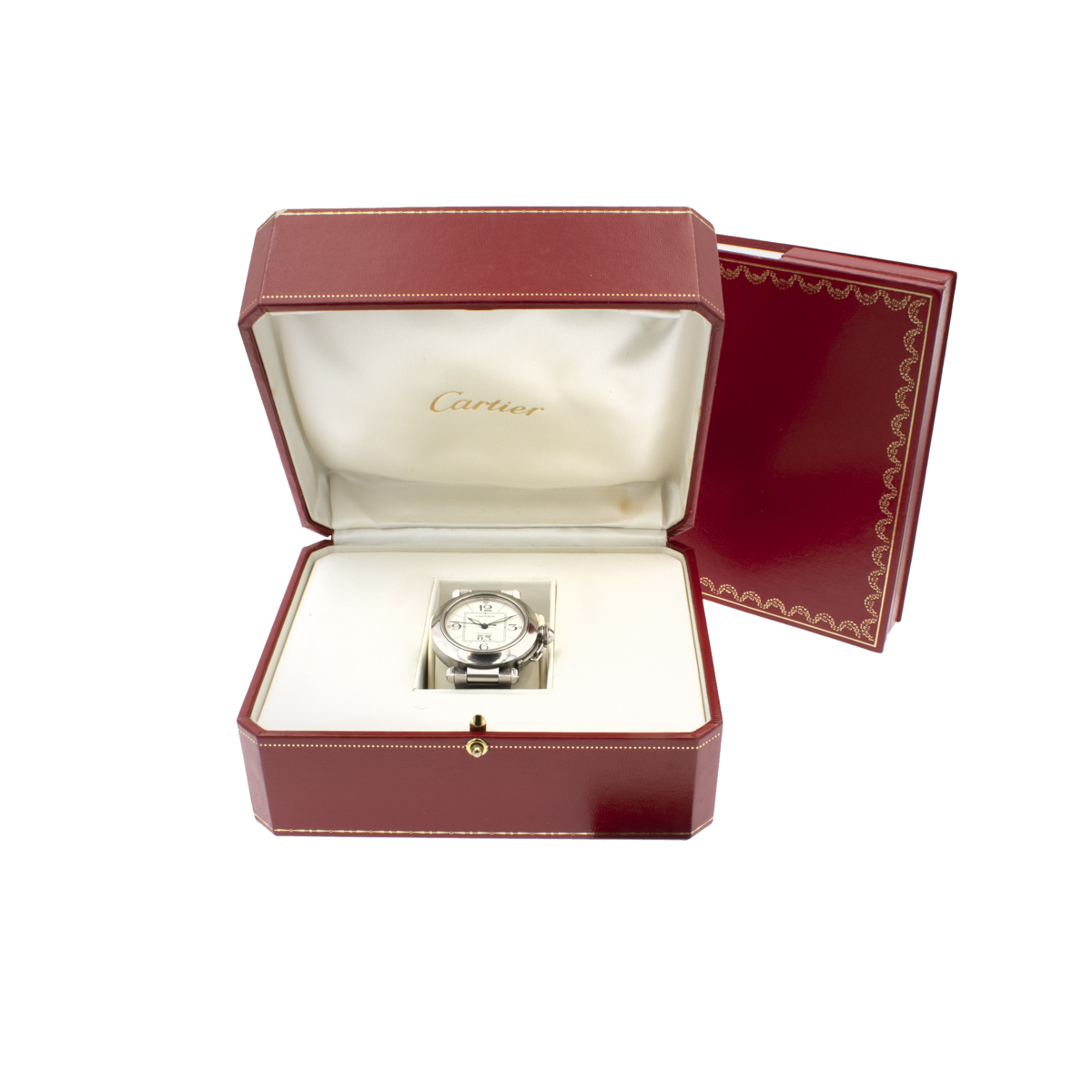 Cartier Pasha C Big Date, orologio da polso anni 2000 circa in acciaio, ref. 132883PB, cassa tonda 35 mm. quadrante bianco con numeri arabi, datario ore 6, movimento meccanico a carica automatica, calibro 2892, bracciale in acciaio con chiusura deployante a scomparsa, cassa, quadrante e movimento firmati, completo di scatola e garanzia