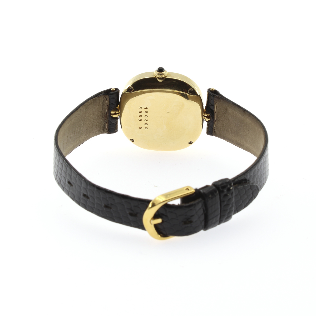 Chopard Happy Diamond, orologio da donna vintage anni 90 circa in oro giallo 18kt, ref. G3407 - 150300 - 5089 5, cassa 25x25 mm. ai lati due diamanti taglio brillante ct 0,30 circa, quadrante champagne senza indici, diamanti ct 0,50 circa che si muovono su fondo in onice nero, vetro zaffiro, lievi difetti, movimento meccanico a carica manuale, calibro R55, cinturino in pelle con fibbia in metallo dorato, cassa, quadrante e movimento firmati