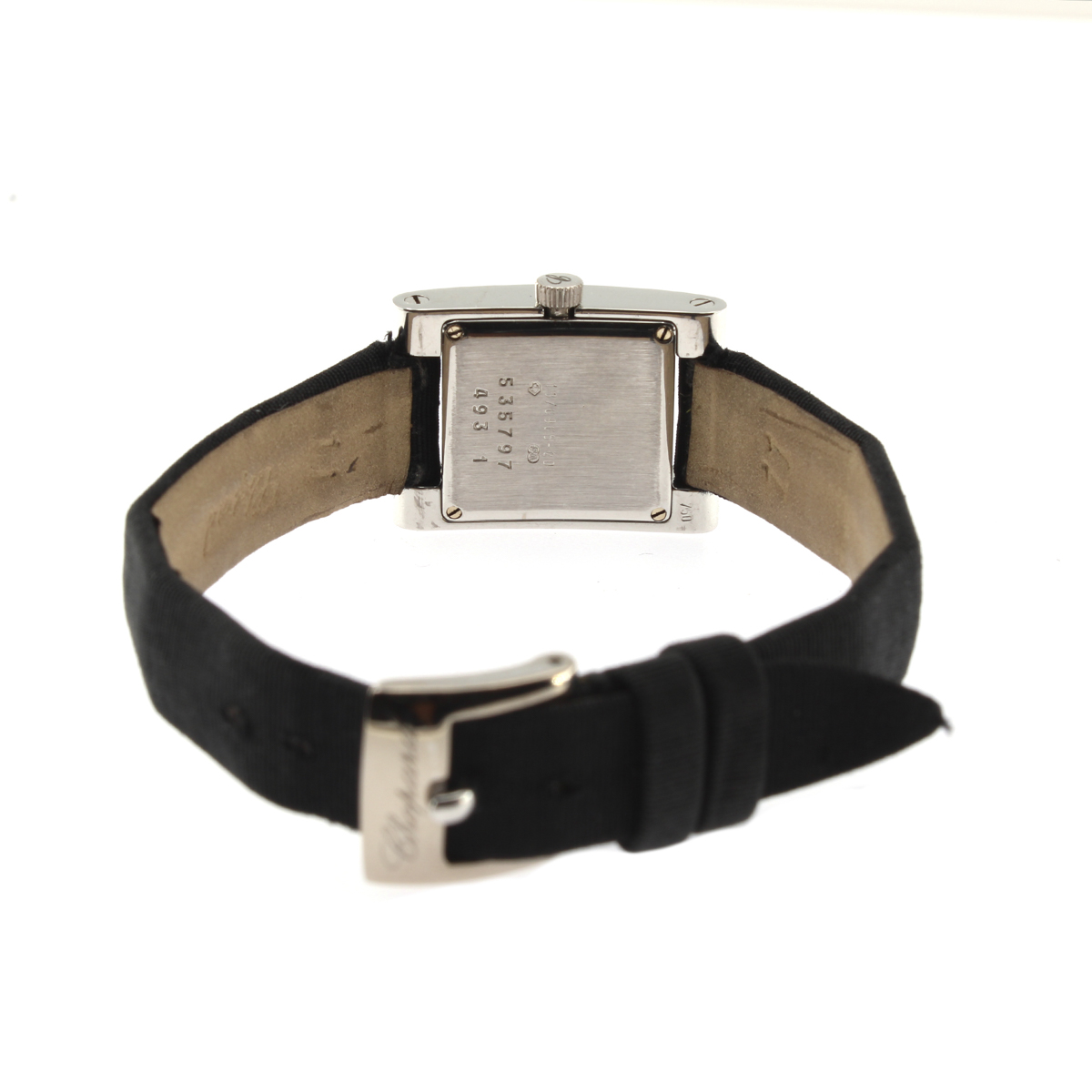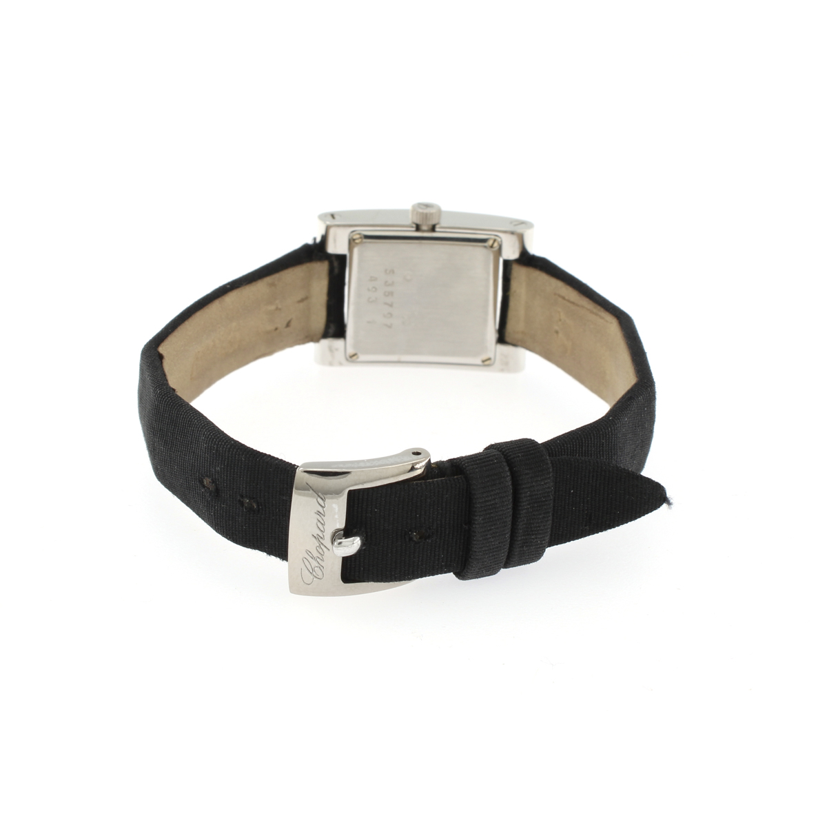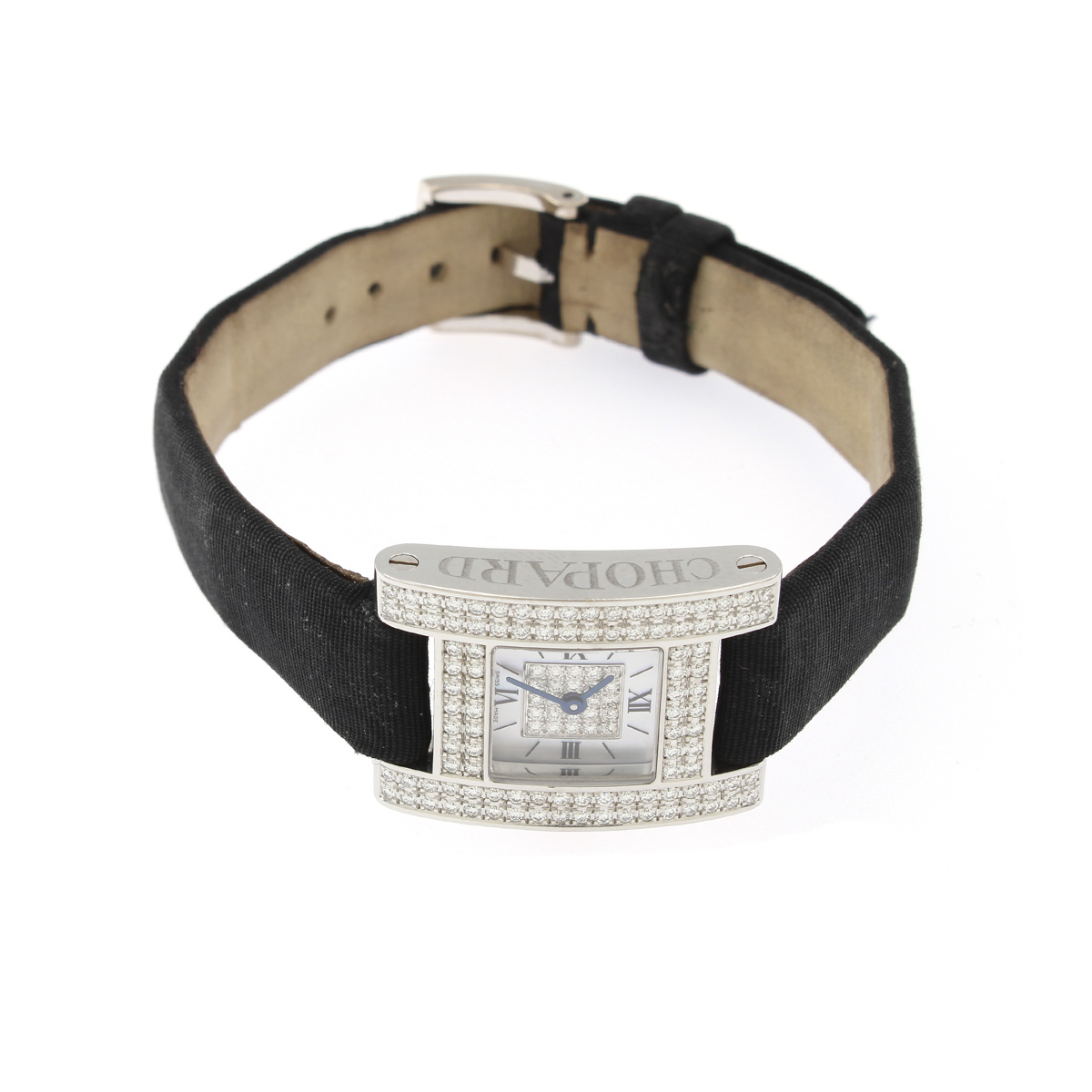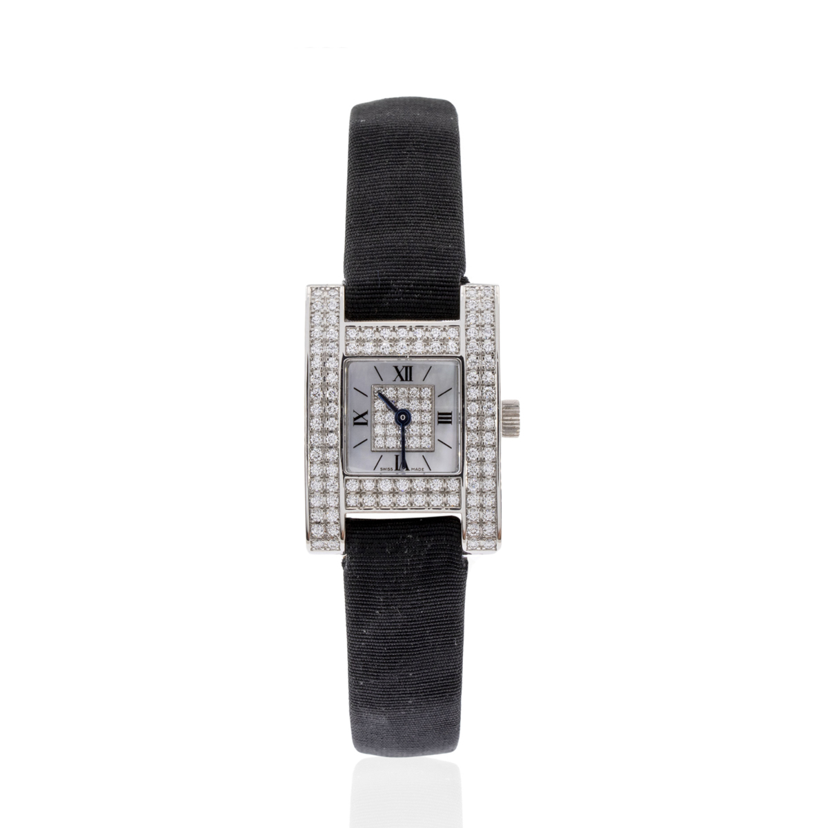 Chopard, orologio da donna vintage anni 2000 circa in oro bianco 18kt ref. 535797- 493 1, cassa rettangolare 26x19 mm. impreziosita da diamanti taglio brillante ct 1,30 circa, quadrante duodial in madreperla e diamanti con indici e numeri romani, vetro zaffiro, movimento al quarzo, calibro eta 976001, cinturino originale in tessuto con fibbia originale in oro bianco 18kt, cassa, quadrante e movimento firmati