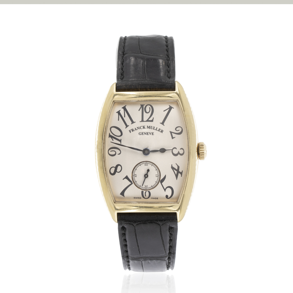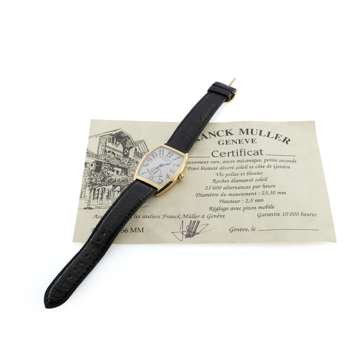 Frank Muller Casablanca orologio da polso vintage anni 80, edizione limitata n.10 in oro giallo 18kt, ref. 7500 S6 MM, cassa 38x28 mm. quadrante argentato con numeri romani, contasecondi ore 6, vetro zaffiro, movimento meccanico a carica manuale, calibro peseux 700, cinturino in pelle con fibbia originale in oro giallo 18kt, cassa, quadrante e movimento firmati, completo di certificato