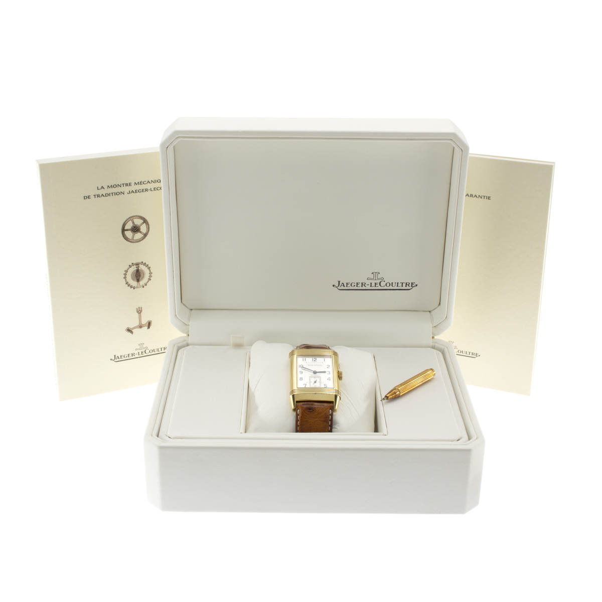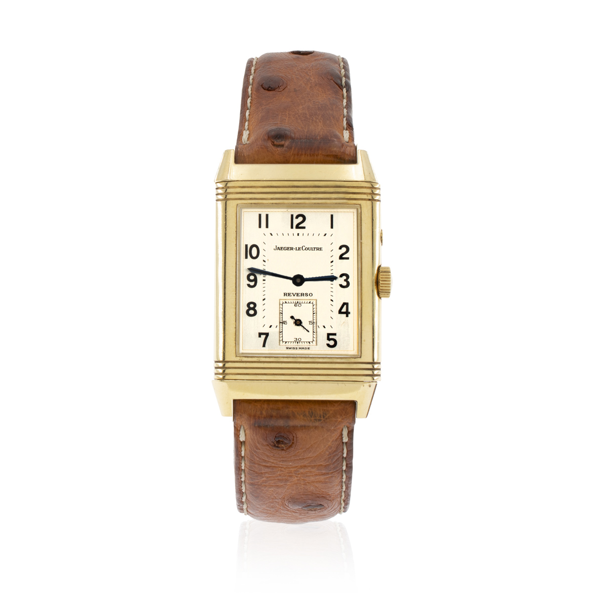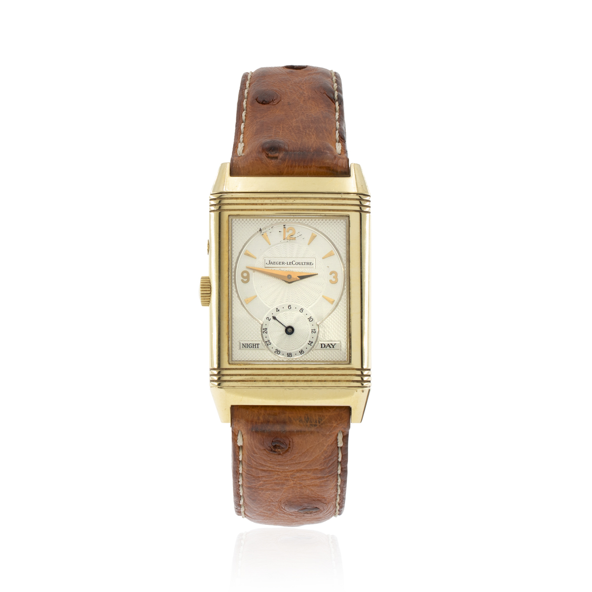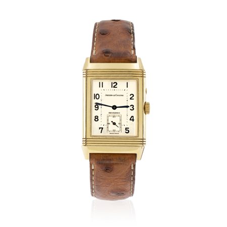 Jager Le Coultre Reverso Duoface Night/Day, orologio da polso anni 90 in oro giallo 18kt, ref. 1763460 - 270.1.54, cassa rettangolare 42x26 mm. da un lato con quadrante argentato guilloché con numeri arabi e contasecondi ore 6, l'altro con quadrante argentato guilloché delle piccole 24 ore e il pulsante sul lato della corona regola la lancetta delle ore per un secondo fuso orario, vetri zaffiro, movimento meccanico a carica manuale, calibro 854, cinturino in pelle con fibbia originale in oro giallo 18kt, cassa, quadrante e movimento firmati, completo di scatola e garanzia