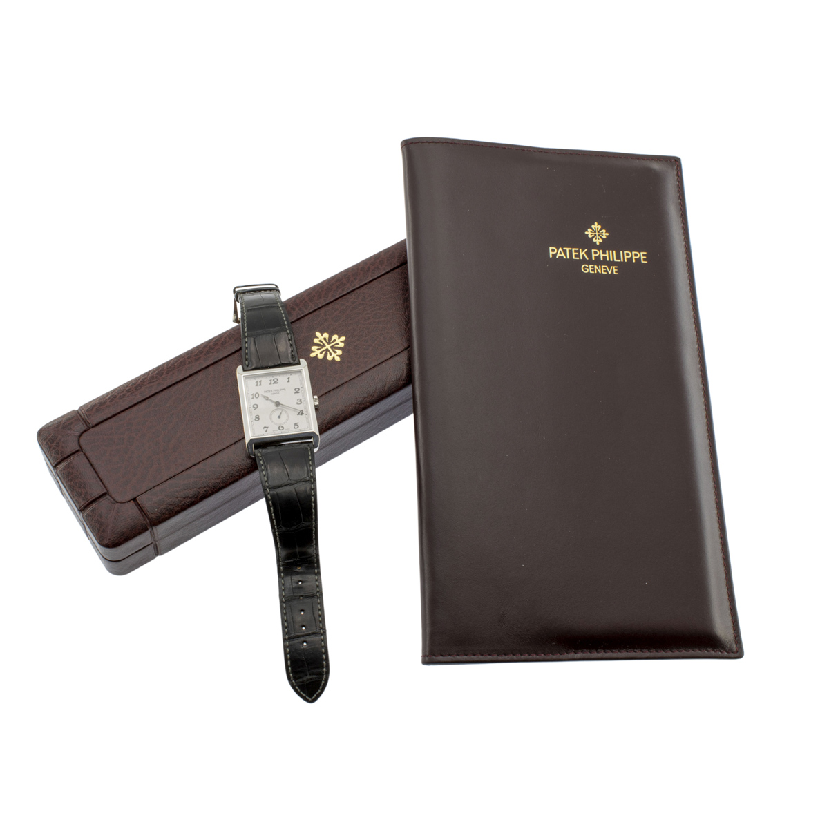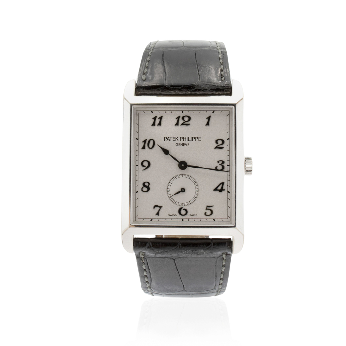 Patek Philippe Gondolo orologio da polso anno 2010 circa in oro grigio 18kt, ref. 5109G - 001, cassa rettangolare 43x30 mm. quadrante argentato con numeri romani, contasecondi ore 6, vetro zaffiro, movimento meccanico a carica manuale, calibro 215, cinturino in pelle con fibbia originale in oro bianco 18kt, cassa quadrante e movimento firmati, completo di scatola e garanzia