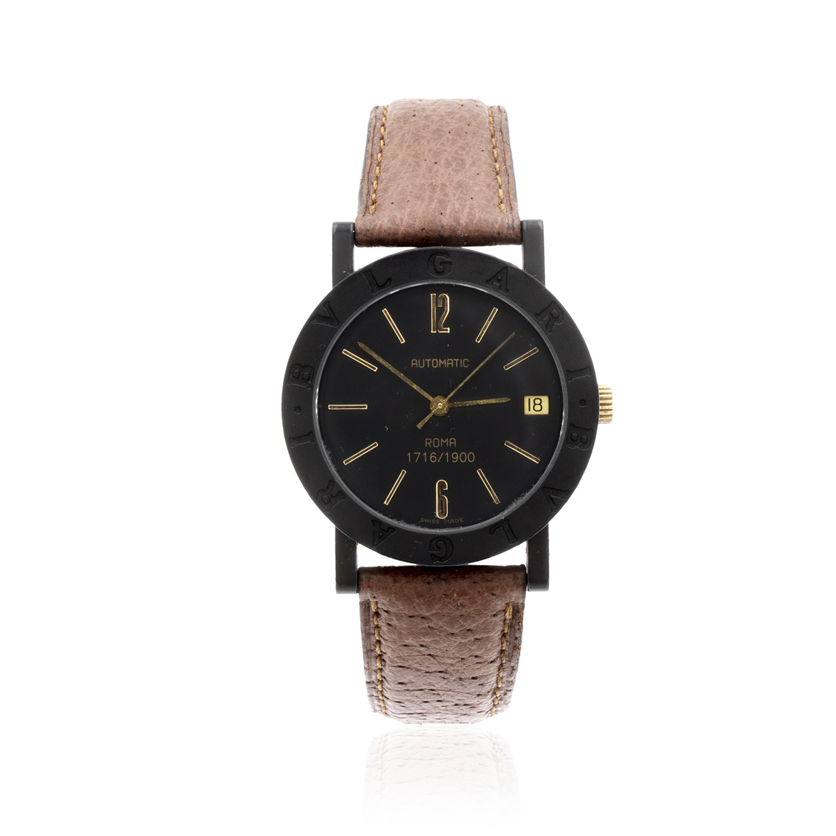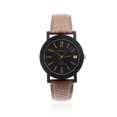 Bulgari Carbon Gold Roma, orologio da polso vintage edizione limitata 1716/1900, anni 90 in fibra di carbonio, ref. BB33VLD, cassa diametro 33 mm. quadrante nero con indici e numeri arabi, datario ore 3, movimento meccanico a carica automatica eta 2824/2, cinturino originale in pelle con fibbia in carbonio, cassa, quadrante e movimento firmati