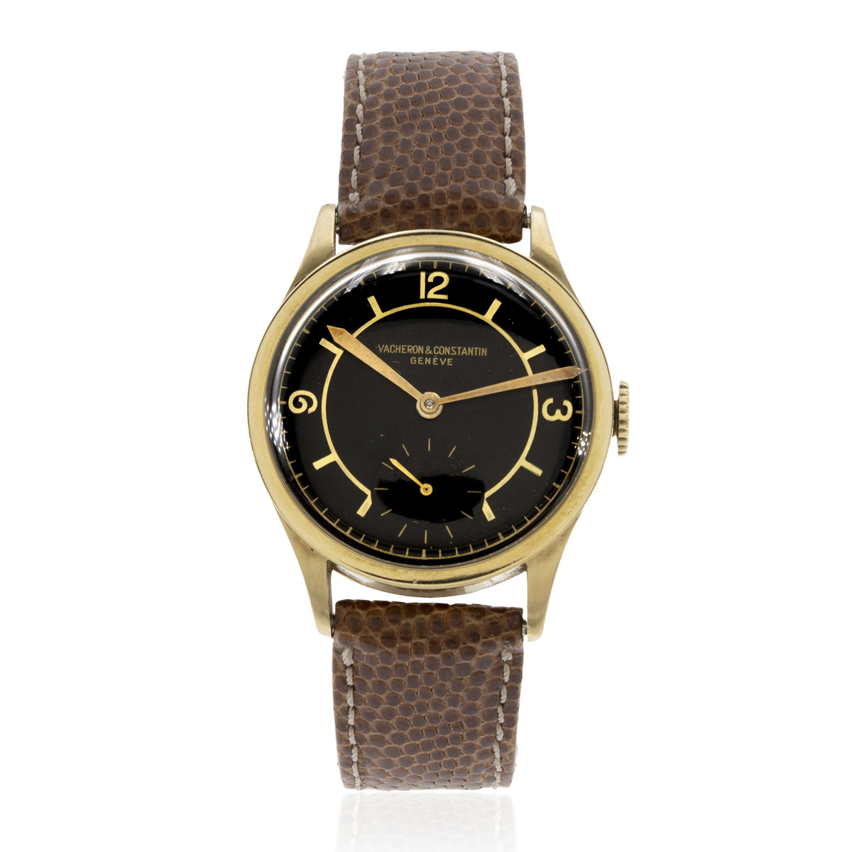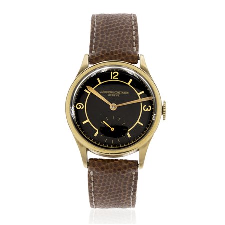 Vacheron Constantin Moneta orologio da polso vintage anni 30/40 in oro giallo 18kt, ref. 258932 - 368236, cassa tonda 30 mm. quadrante nero con indici e numeri arabi ristampato, contasecondi ore 6, movimento meccanico a carica manuale, cinturino in pelle con fibbia placcata oro, cassa e movimento firmati