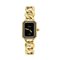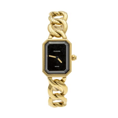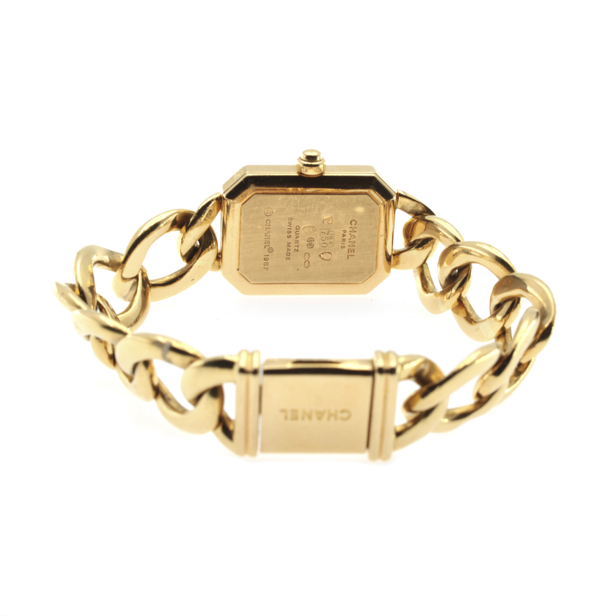 Chanel orologio da donna vintage collezione Premiere anno 1987 peso 77 gr. in oro giallo 18kt, cassa 26x20 cm. quadrante nero senza indici, vetro zaffiro, movimento al quarzo, bracciale in oro giallo 18kt a maglia groumette, chiusura a cofanetto, cassa, quadrante e movimento firmati, lunghezza 18 cm.