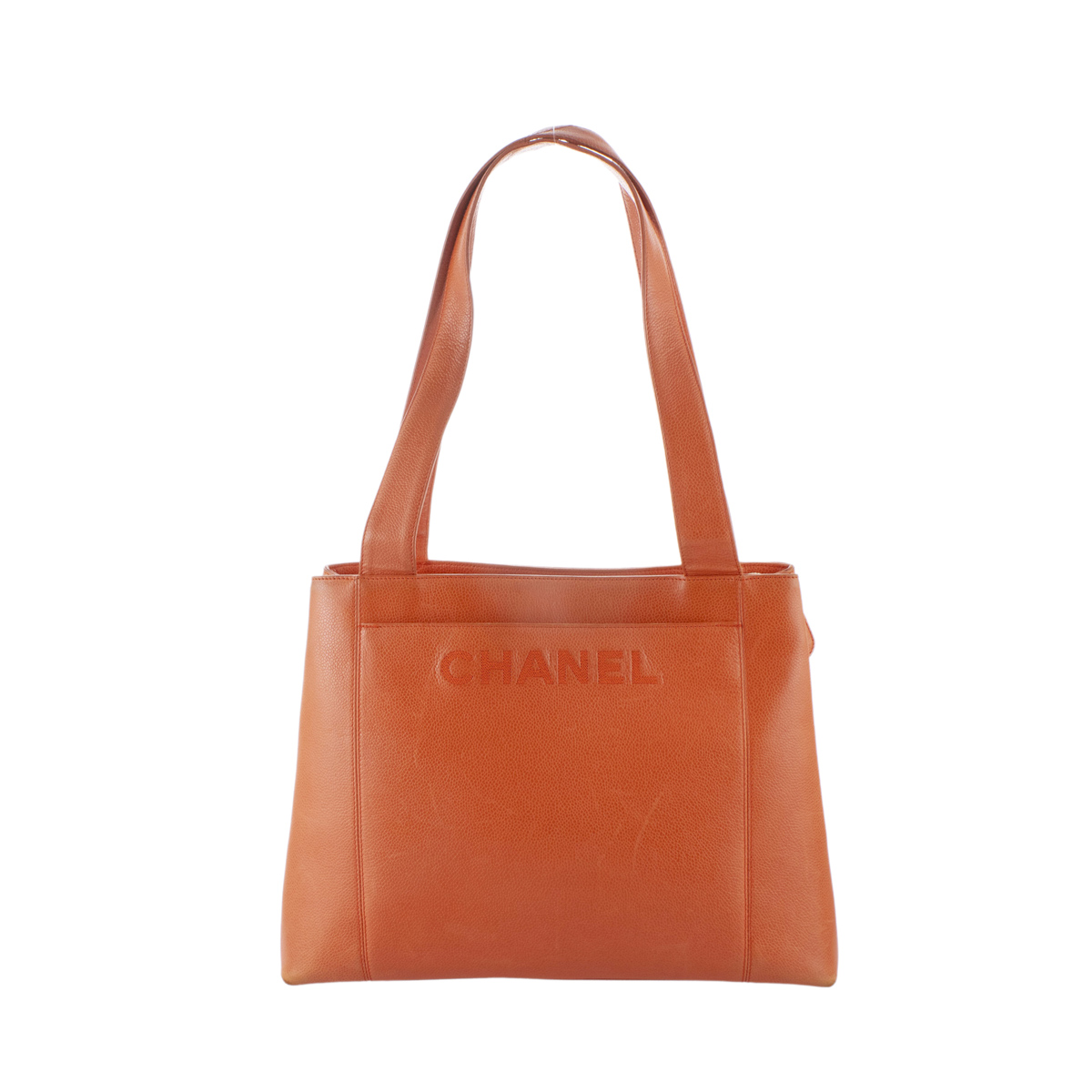 Chanel Tote Bag Matt borsa a spalla vintage 1996/1997 misure 36x28x11 cm. in pelle martellata arancio a due manici, finiture dorate, interno in tessuto a tre scomparti di cui il centrale con chiusura a cerniera e due tasche a zip, due tasche esterne con logo ricamato, completa di dust bag e garanzia