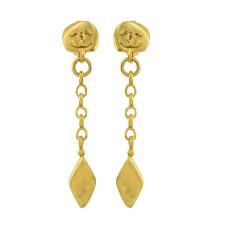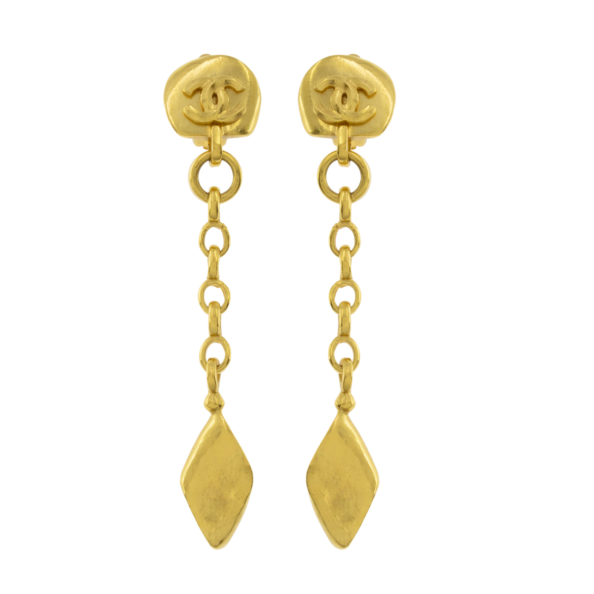 Chanel orecchini pendenti bijou vintage anno 1996 in metallo dorato con logo, completi di scatola