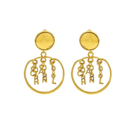 Chanel orecchini pendenti bijou vintage anno 1996 in metallo dorato con scritta, completi di scatola