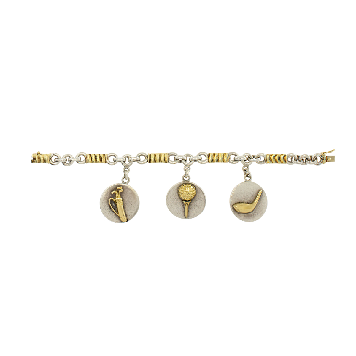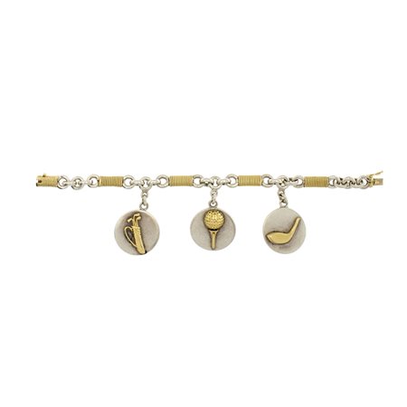 Hermes bracciale Golf anni 70/80 peso 68 gr. in oro giallo 18kt e argento 925, tre pendenti a tema golf, lunghezza 18,5 cm.