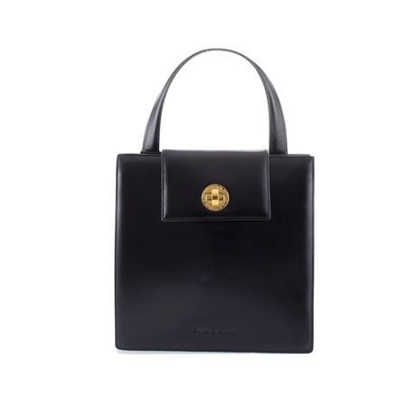 Bulgari borsa a mano vintage misure 24x24x10 cm. in pelle nera, finiture dorate, interno in tessuto a due scomparti, due tasche a cerniera, una tasca esterna, chiusura a lucchetto con logo, manico in pelle, completa di dust bag