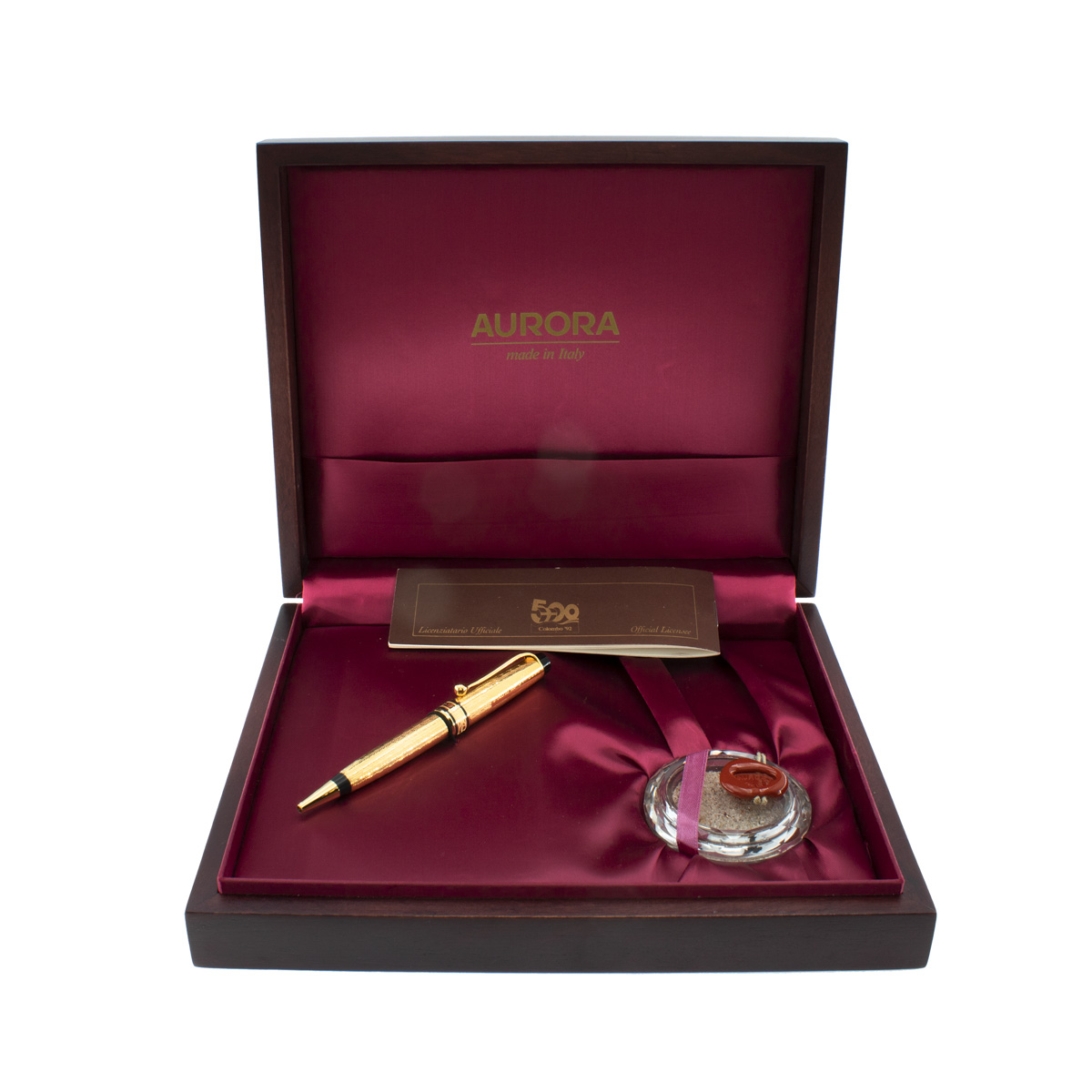 Aurora 500 Colombo, penna a sfera edizione limitata, 1492-1992 lunghezza 12,5 cm. in oro laminato e resina nera, n. 0968/1492, set impreziosito da uno scrigno contenente la sabbia dell'Isola di San Salvador e tre pepite d'oro massiccio, simbolo delle Caravelle di Cristoforo Colombo, completa di scatola originale e garanzia