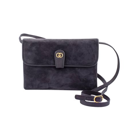 Gucci borsa a mano vintage anni 70/80 misure 21,5x15,5x3 cm. in pelle scamosciata grigia, finiture in pelle, interno a due scomparti con due tasche di cui una a cerniera, tracolla removibile in pelle, chiusura a pressione con logo dorato, completa di dust bag