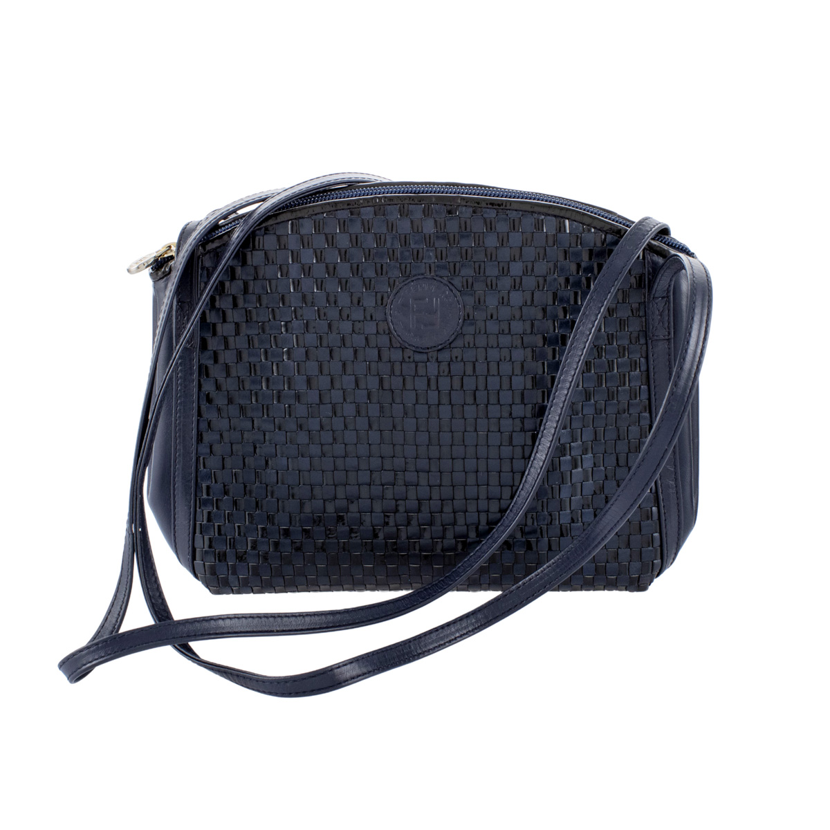 Fendi borsa a spalla vintage anni 90 misure 22x18x7,5 cm. in pelle blu e vernice nera intrecciate, interno in pelle ad uno scomparto con tasca a zip e chiusura a cerniera, doppia tracolla in pelle, completa di dust bag e scatola
