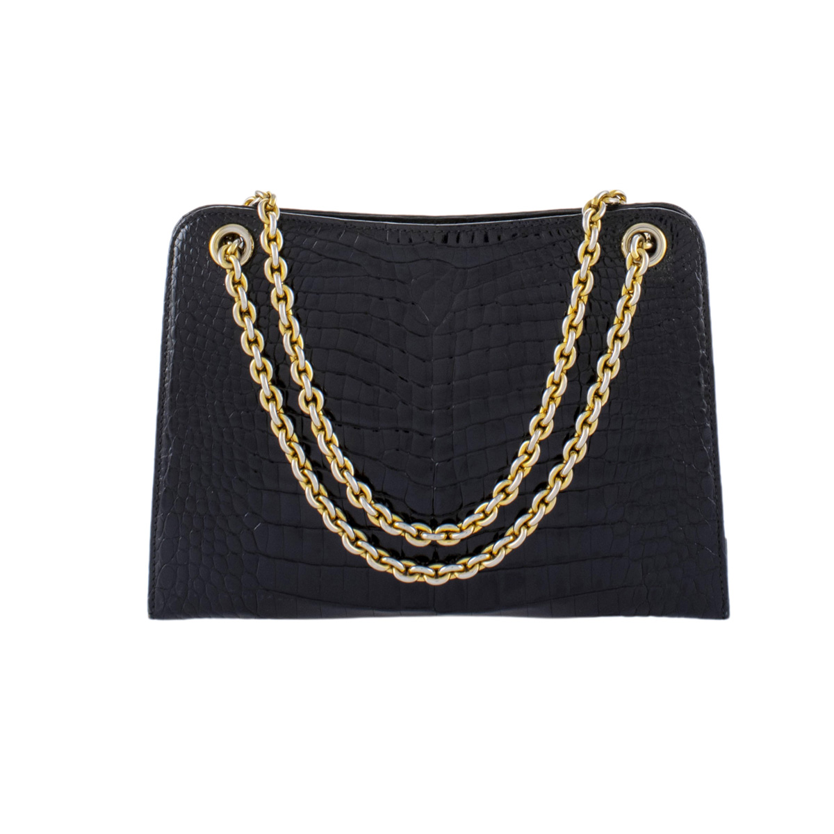 Giorgio Gucci borsa a mano vintage anni 60 circa misure 24,5x18x4,5 cm. in pelle esotica, interno in pelle a tre scomparti, tre tasche di cui una a cerniera, chiusura a scatto, tracolla a catena, completa di dust bag