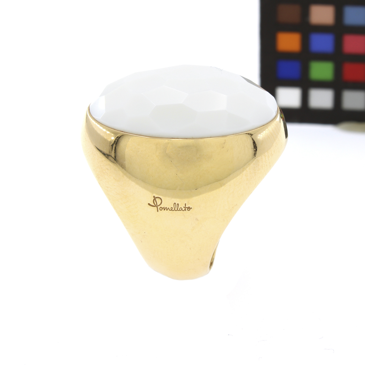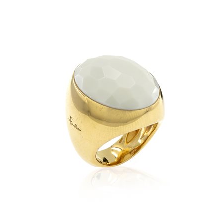Pomellato anello collezione Victoria peso 33 gr. in oro giallo 18kt e agata bianca martellata, misura 15