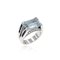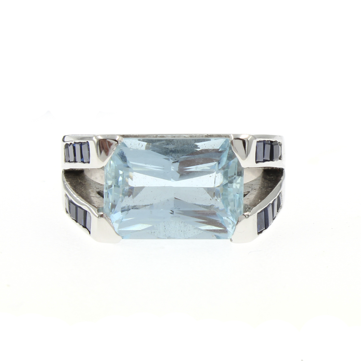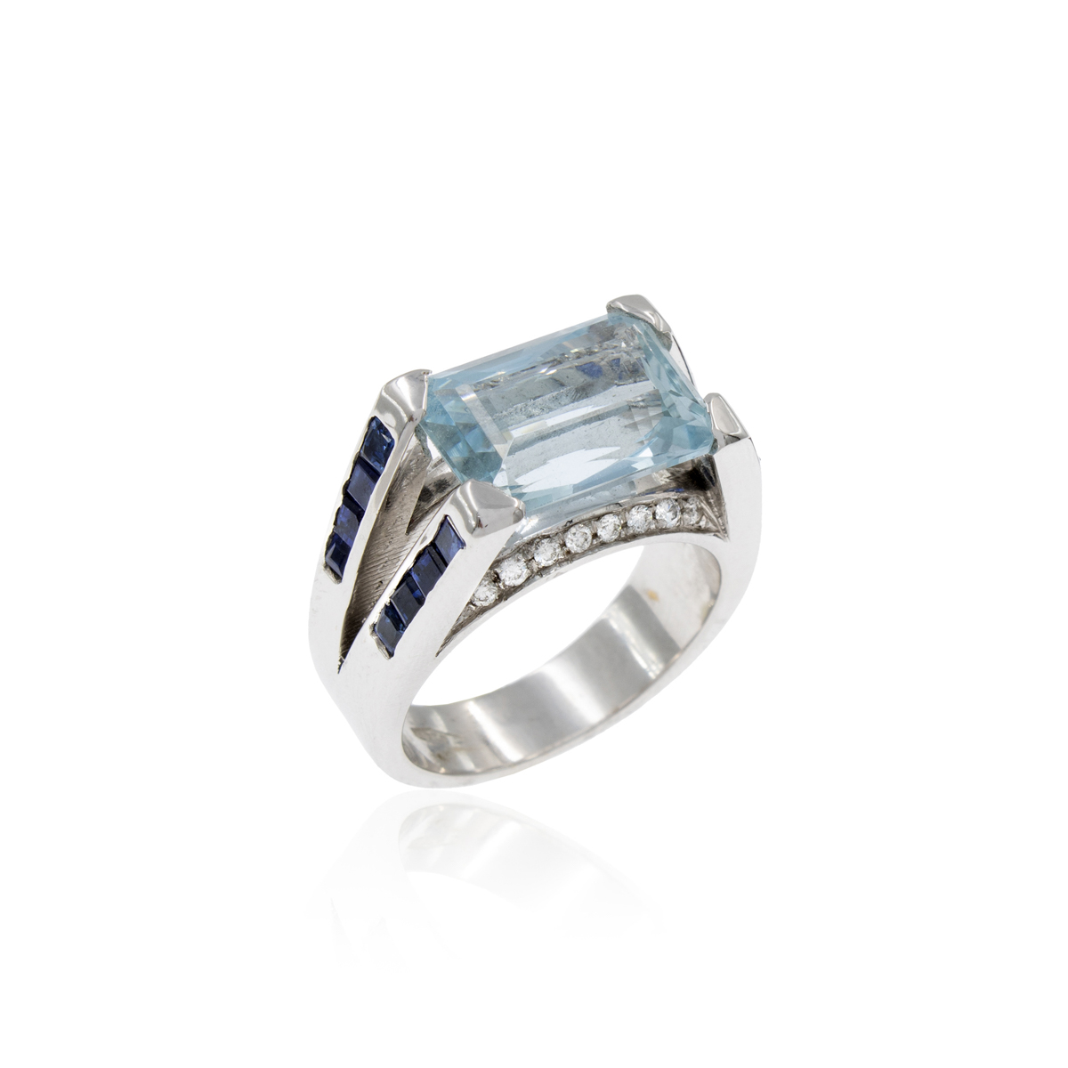 Anello in oro bianco 18kt con acquamarina diamanti e zaffiri peso 12 gr. acquamarina taglio ottagonale a gradini, zaffiri taglio carré ct 1 circa, diamanti taglio brillante ct 0,15 circa, misura 14