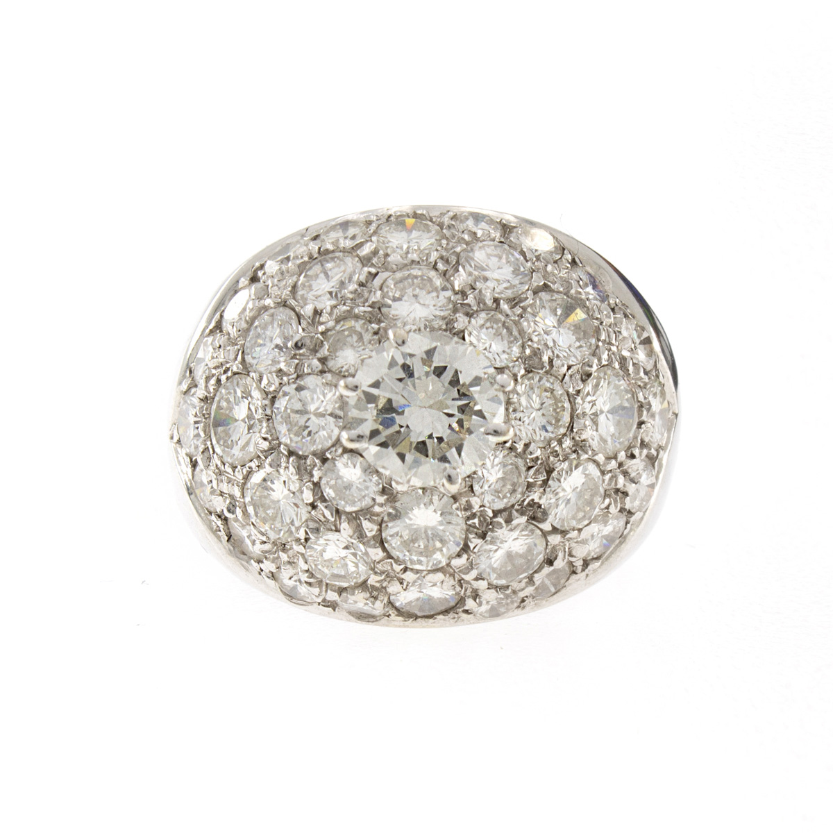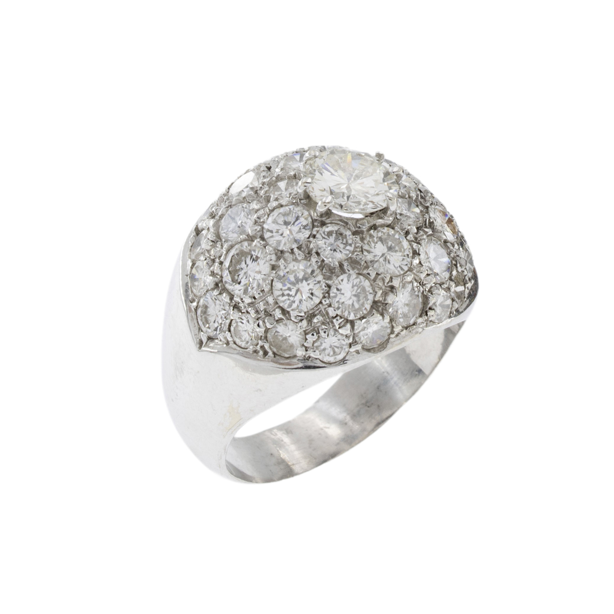 Anello bombé in oro bianco 18kt peso 8 gr. diamante centrale ct 0,50 circa contornato da diamanti taglio brillante ct 1,20 circa, misura 12