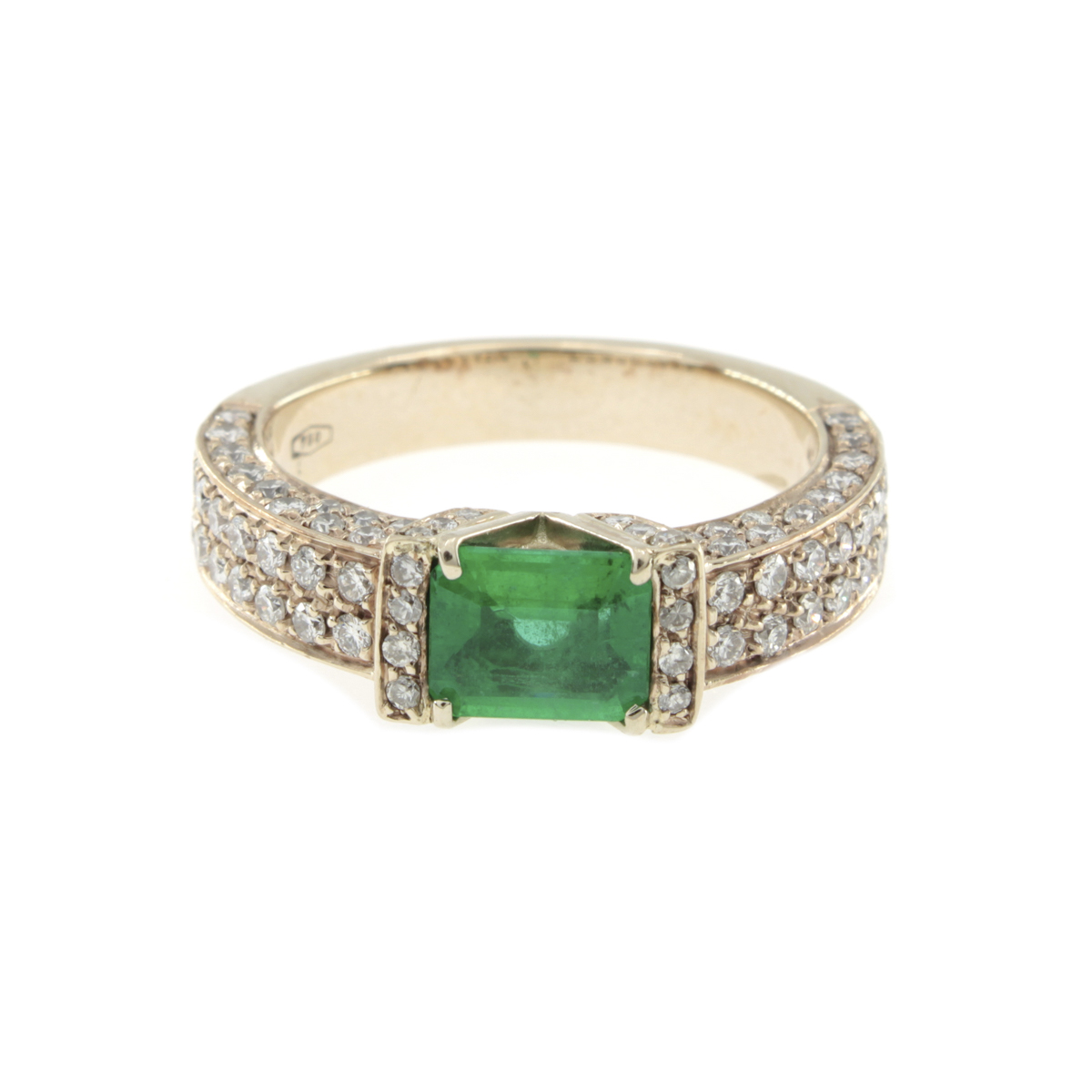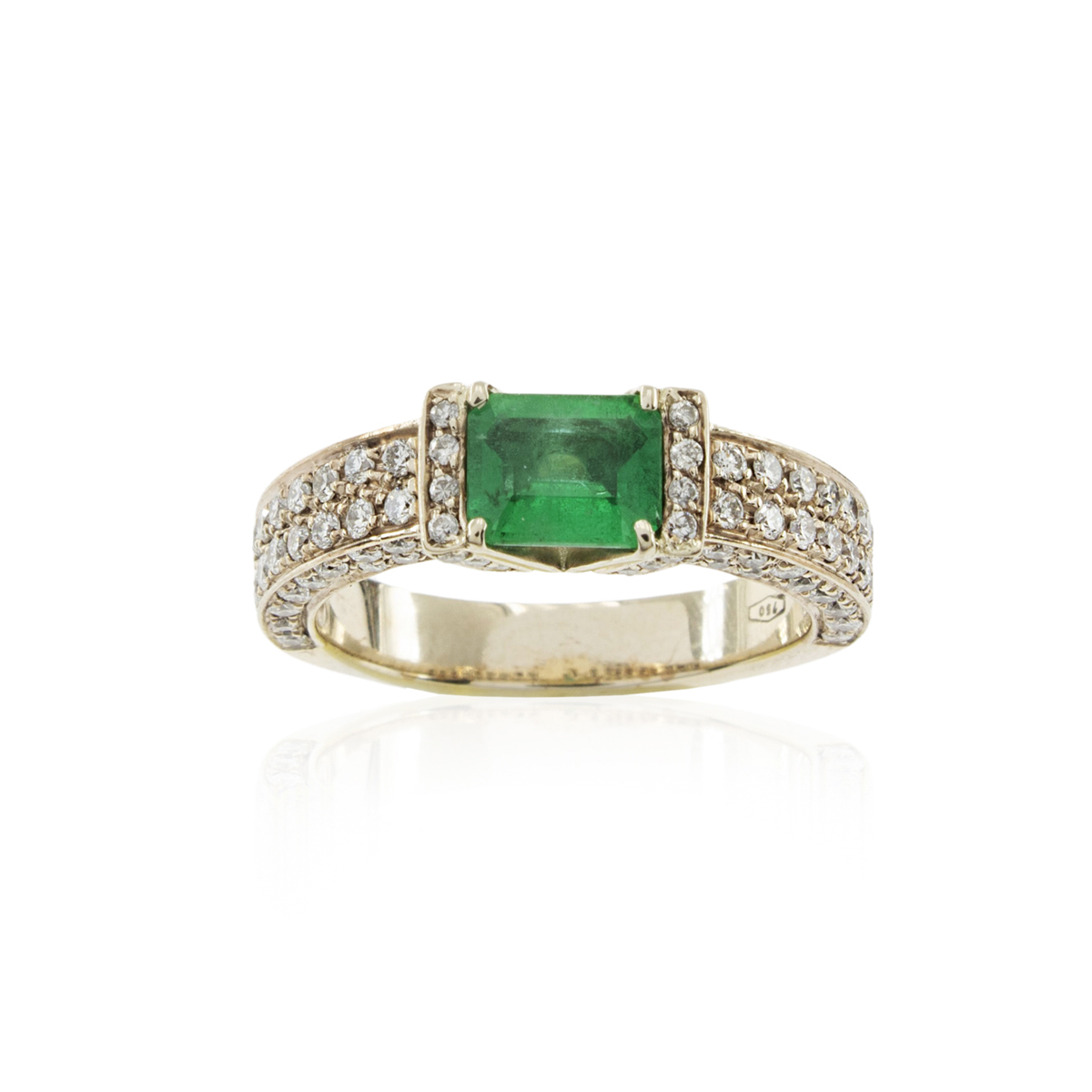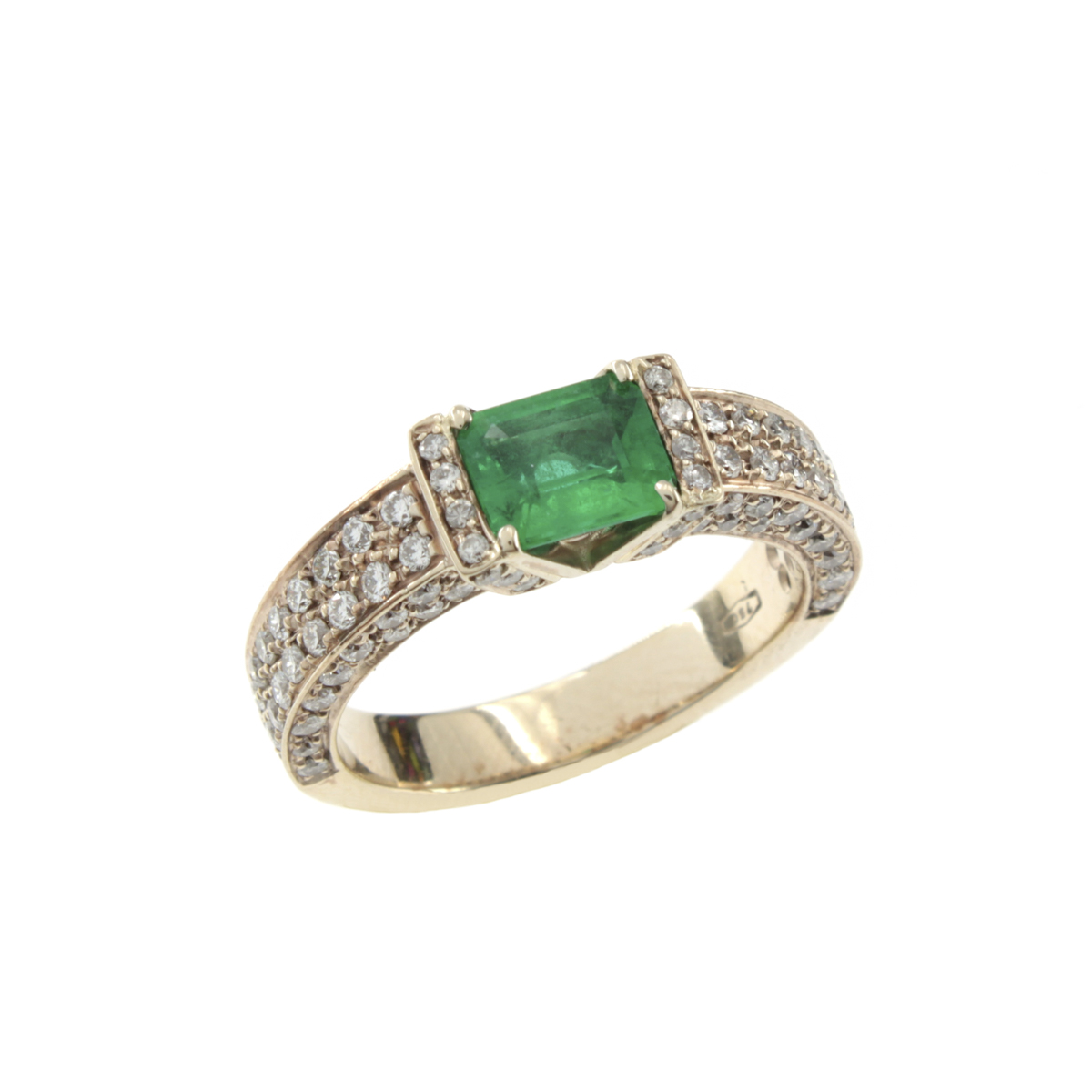 Anello fede in oro bianco 18kt smeraldo peso 7 gr. taglio ottagonale a gradini ct 0,90 circa ai lati diamanti taglio brillante ct 1 circa, misura 14