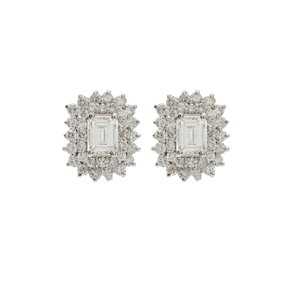 Orecchini a lobo in oro bianco 18kt e diamanti peso 3 gr. due diamanti taglio ottagonale a gradini ct 0,95 circa contornati da diamanti taglio brillante ct 1,20 circa, dimensioni 1,6x1,6 cm.